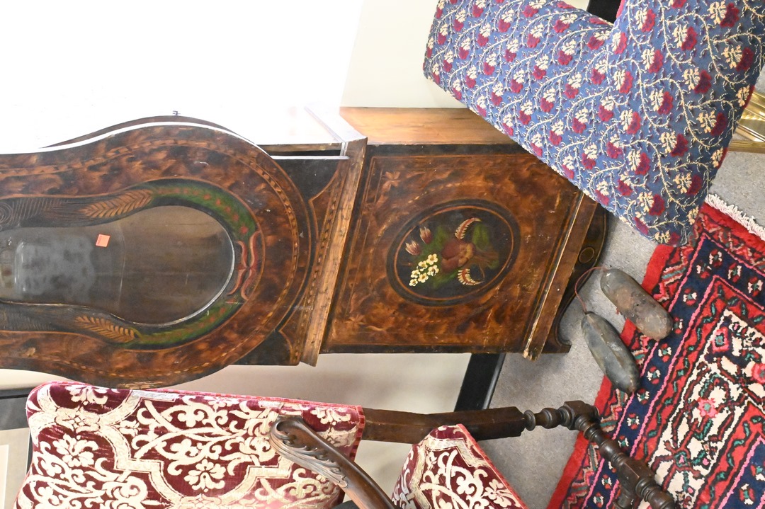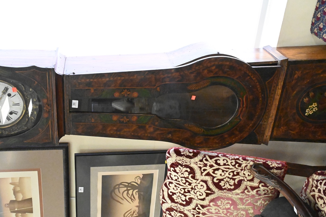 French Tall Clock, having grain painted case, embossed brass and enameled dial, height 90 inches.