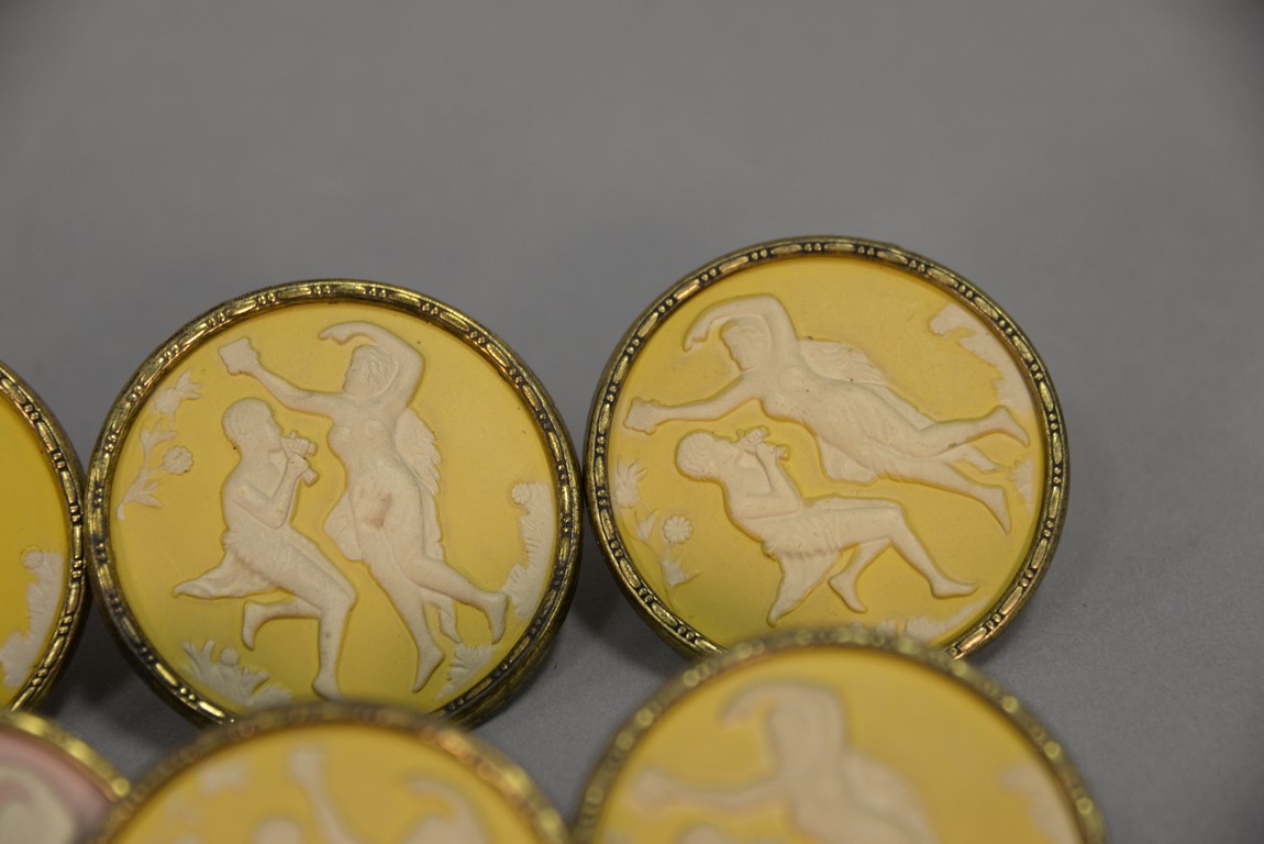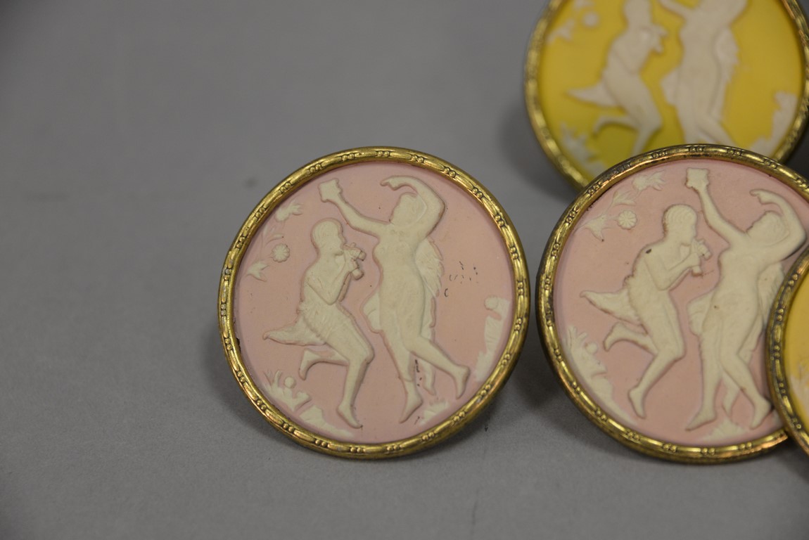 Group of seven Wedgwood Jasperware curtain tie backs, five are yellow with white and two are pink with white, all mounted with brass back. dia. 2 1/2 in.