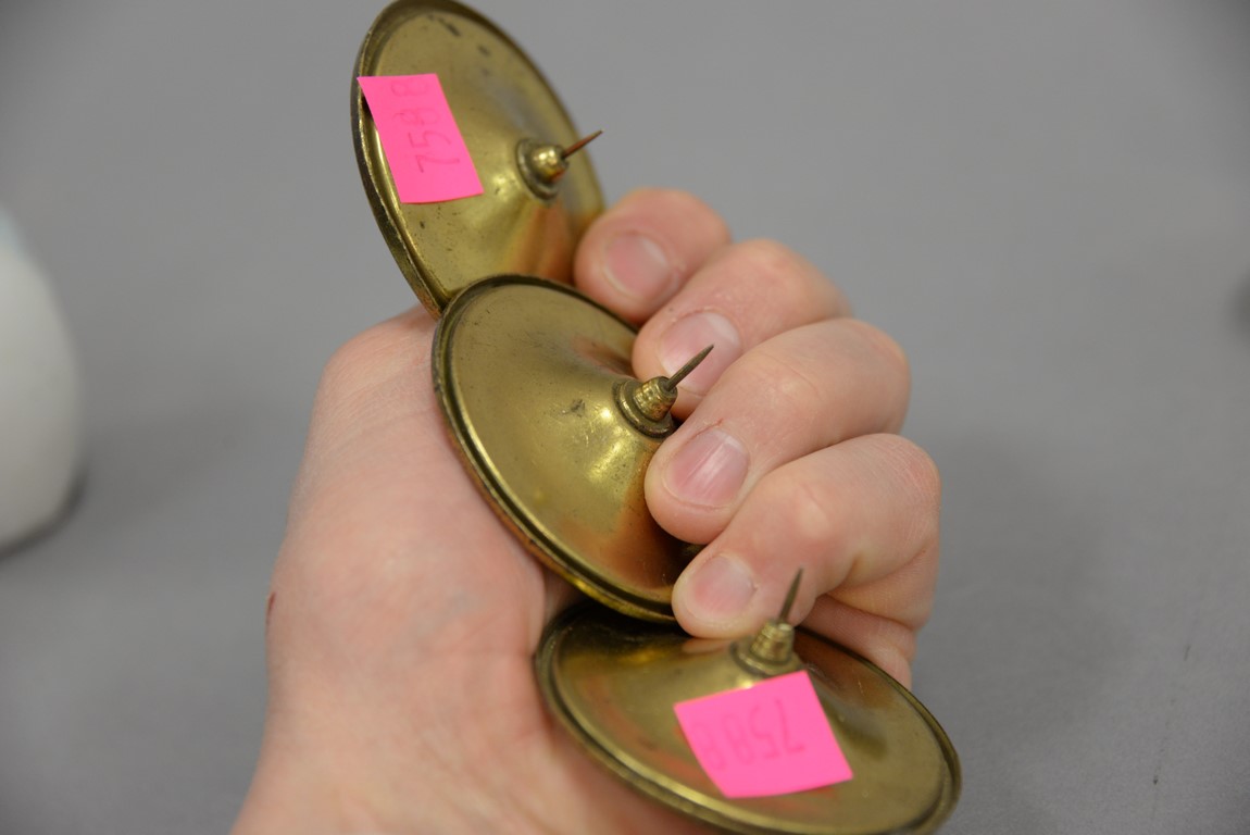 Lot 369: Group of seven Wedgwood Jasperware curtain tie backs, five are yellow with white and two are pink with white, all mounted with brass…