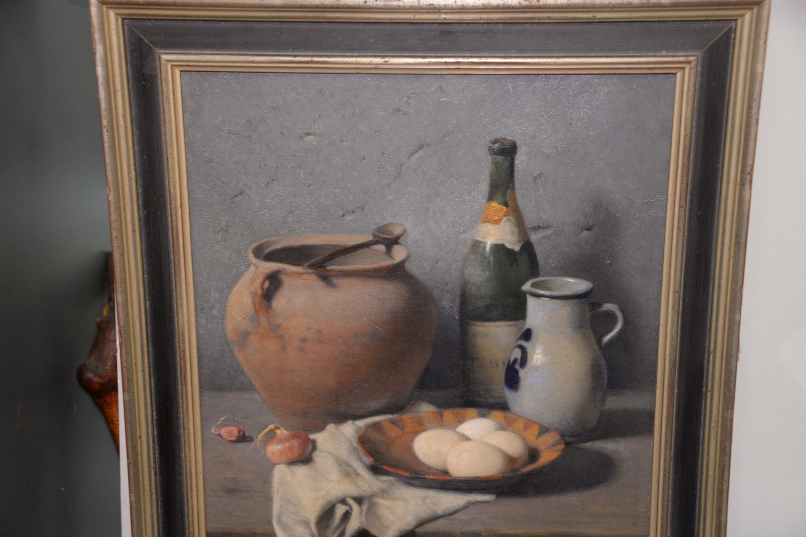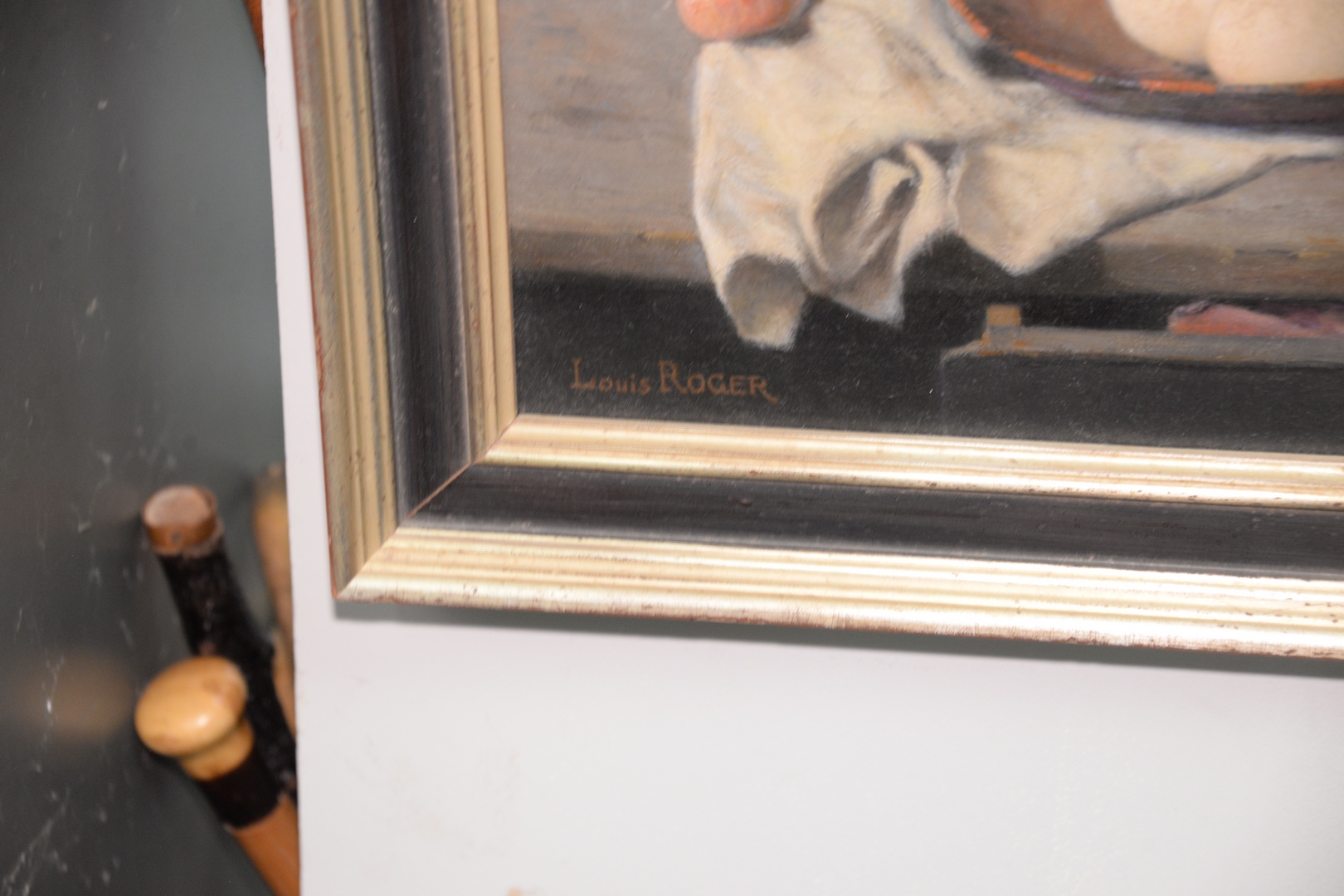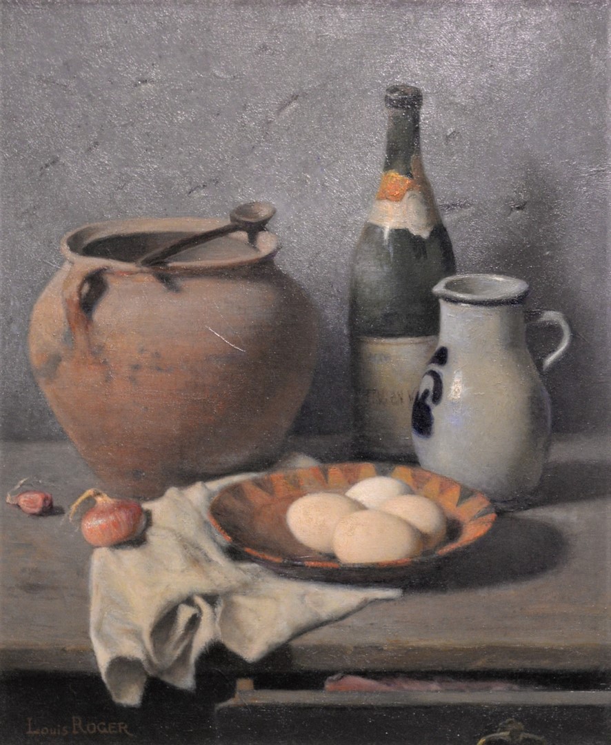 Louis Roger (French, 1873 – 1953), still life with eggs and champagne, oil on canvas, signed lower left “Louis Roger”, 16″ x 13″.