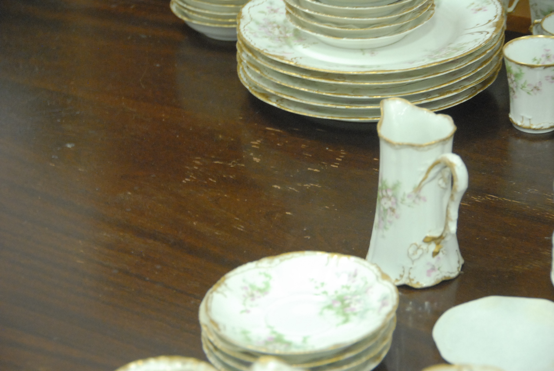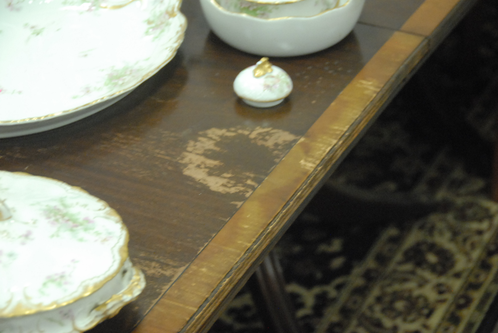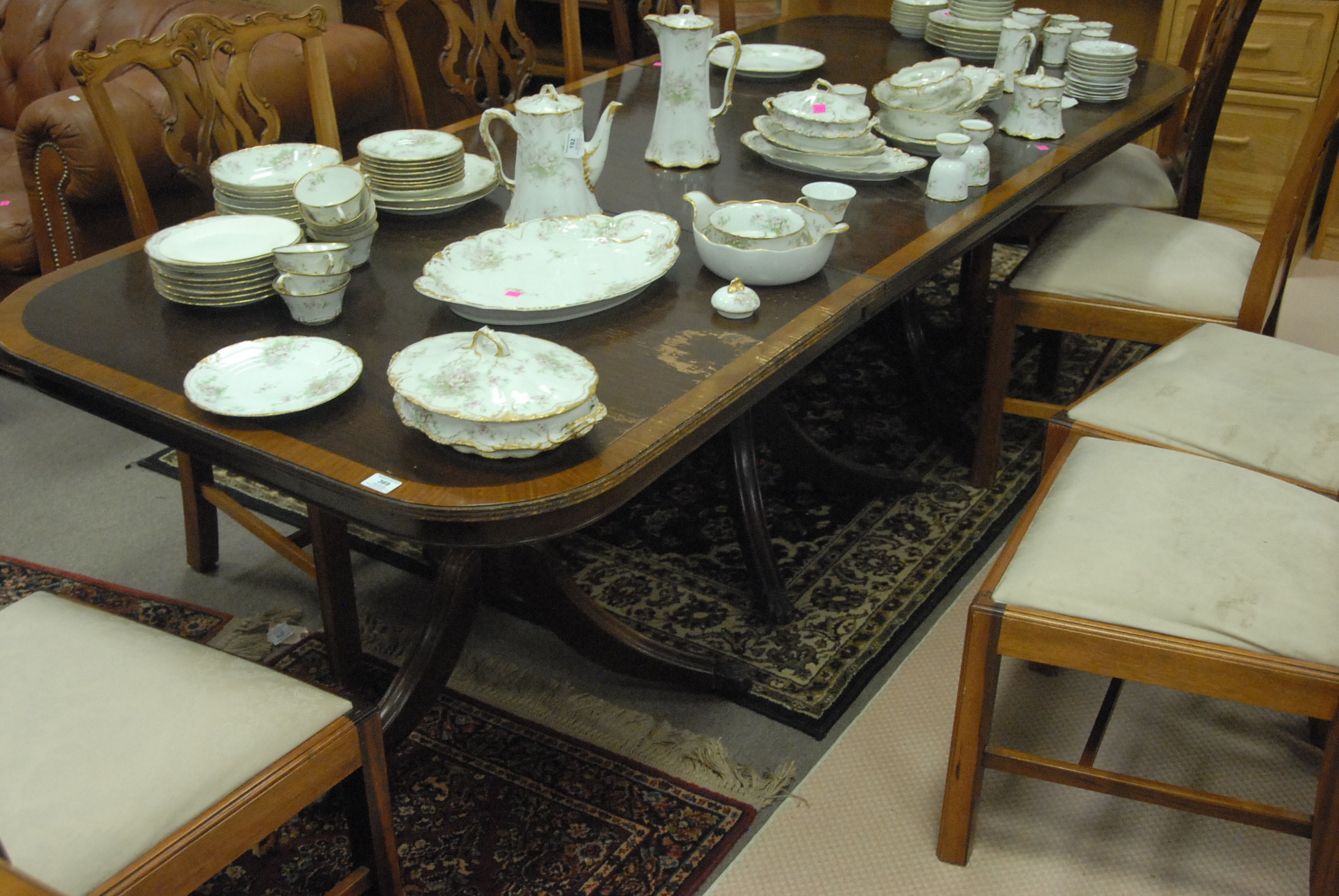 Mahogany triple pedestal dining table with banded inlaid top and two 20 inch leaves top imperfections.lg. 94 1/2 in.