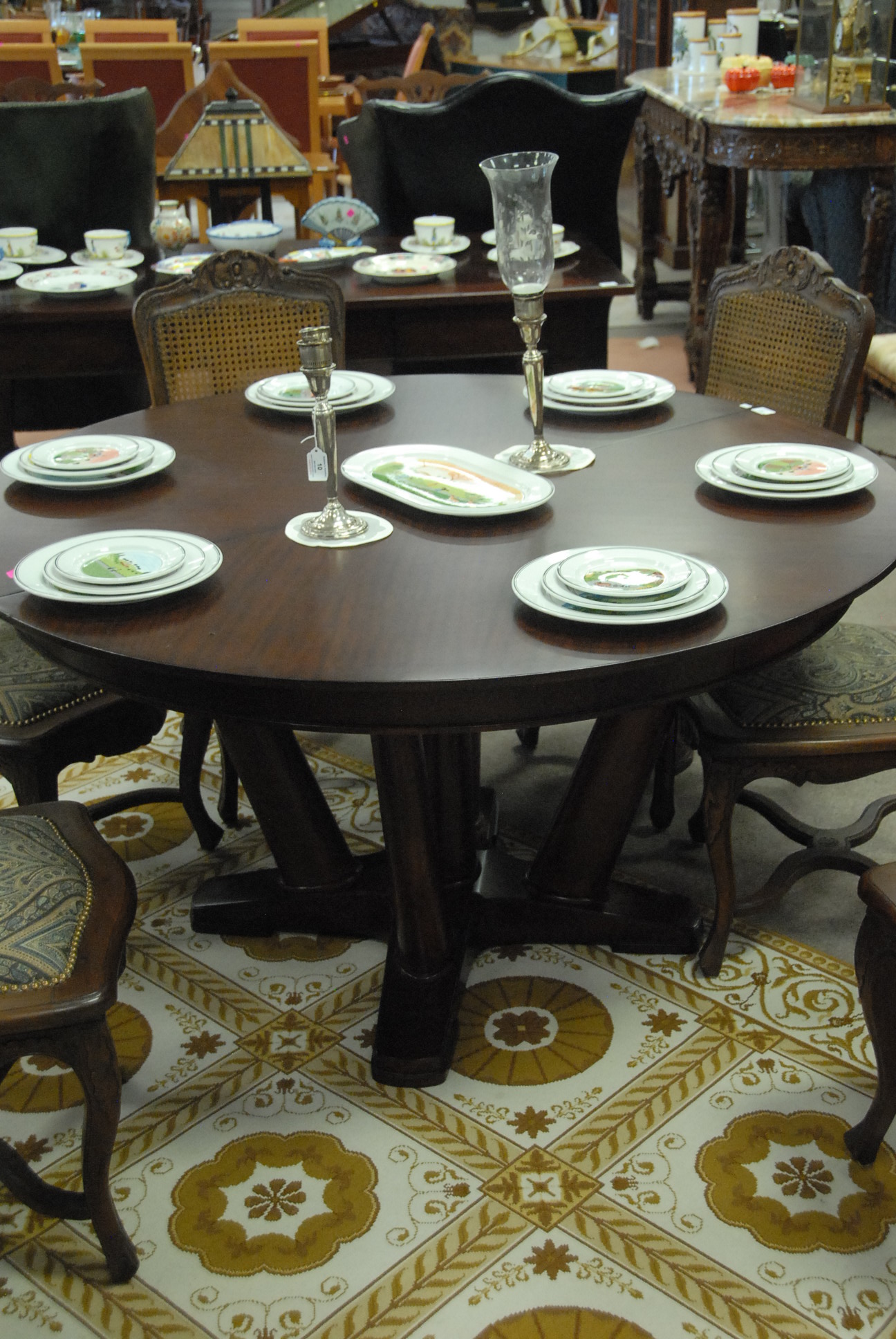 Lot 369: Mitchell Gold & Bob Williams mahogany round pedestal table with one 22 leave, ht. 31 in. dia. 56 in.