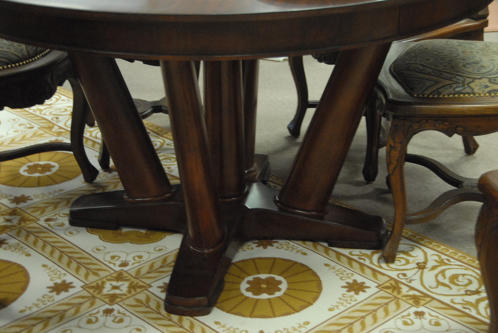Mitchell Gold & Bob Williams mahogany round pedestal table with one 22 leave, ht. 31 in. dia. 56 in.