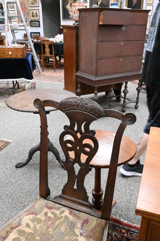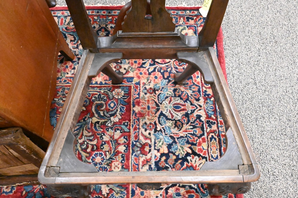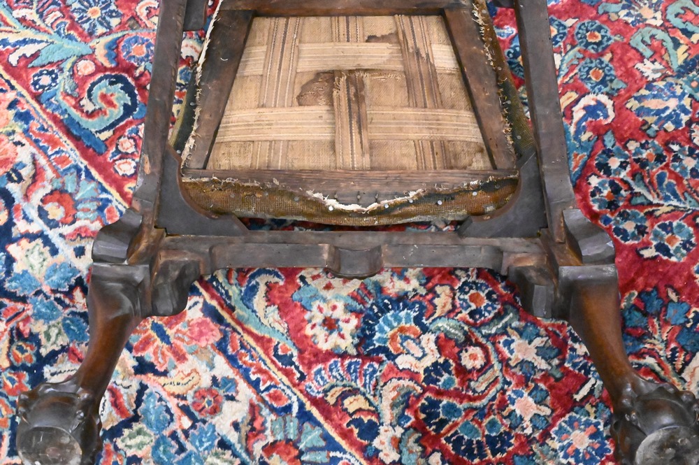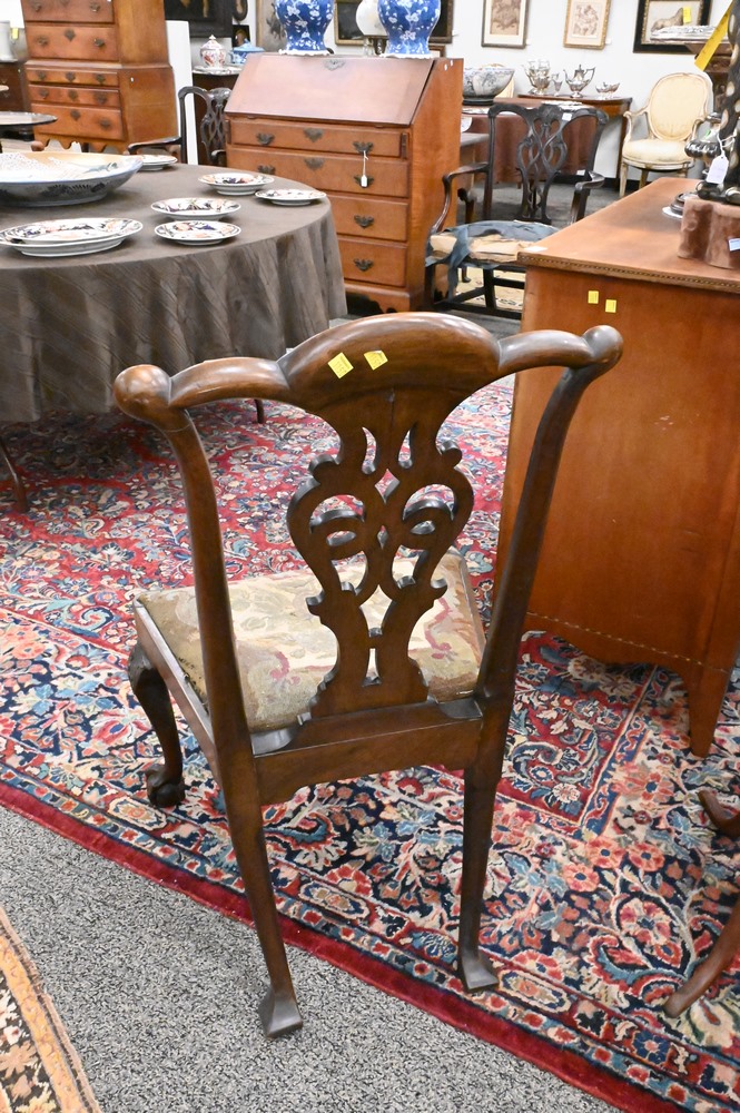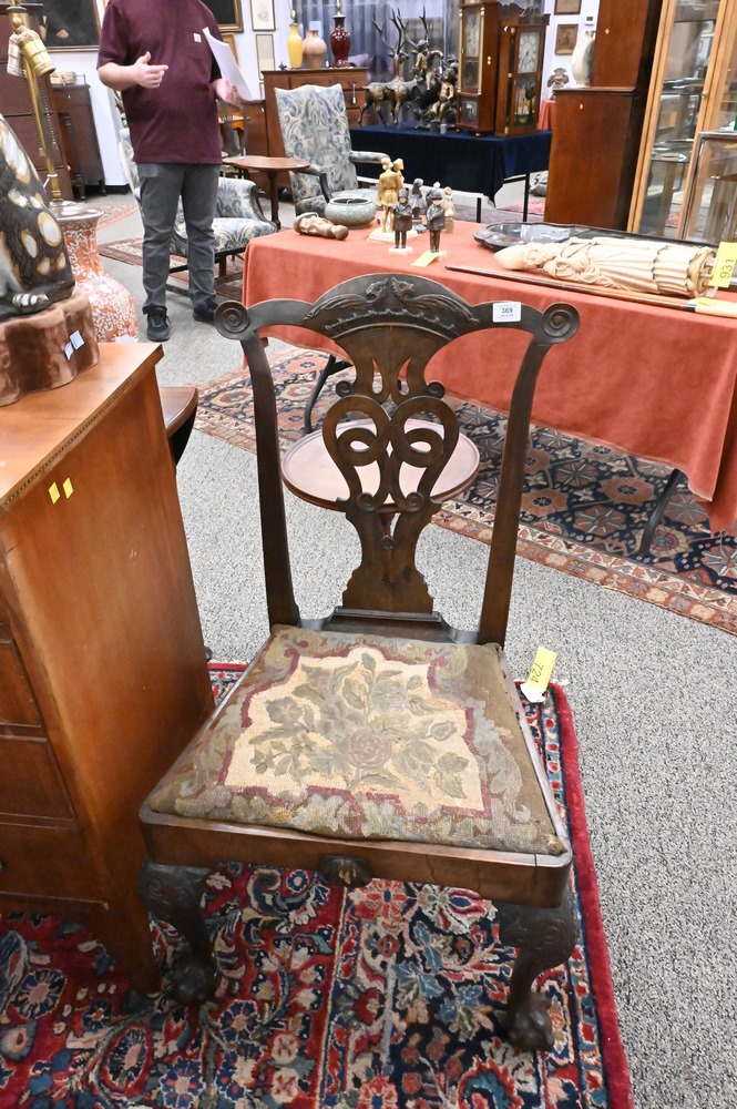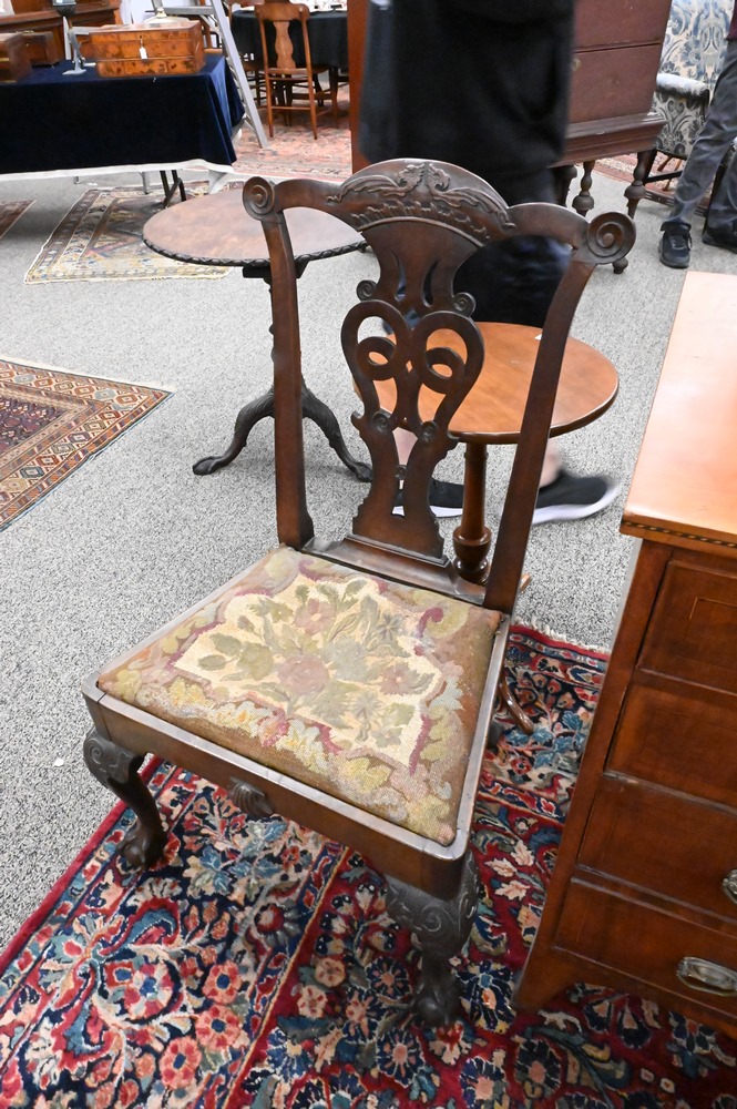 Lot 369: Pair of George III Mahogany Side Chairs, having carved gargoyle on crest over pierced splat, over needlepoint slip seats, set on carved cabriole legs ending in ball and claw feet, 18th century, height 40 inches, seat height 17 1/2 inches. Provenance: Estate of Wallace Bradway, New Haven, CT.
