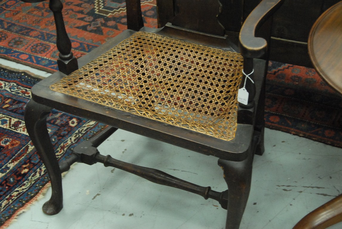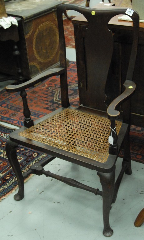 Lot 369: Queen Anne armchair with caned seat, cabriole legs, and pad feet rear splat repaired, cane repair needed. seat ht. 17in. Provena…..
