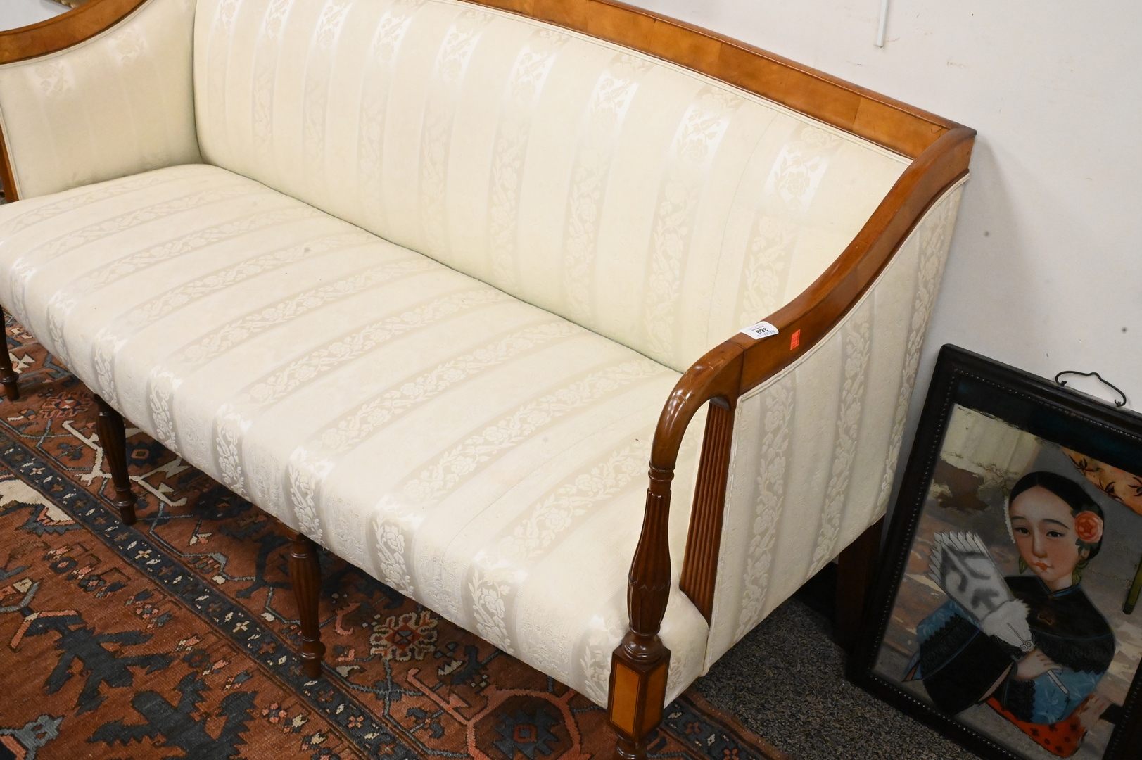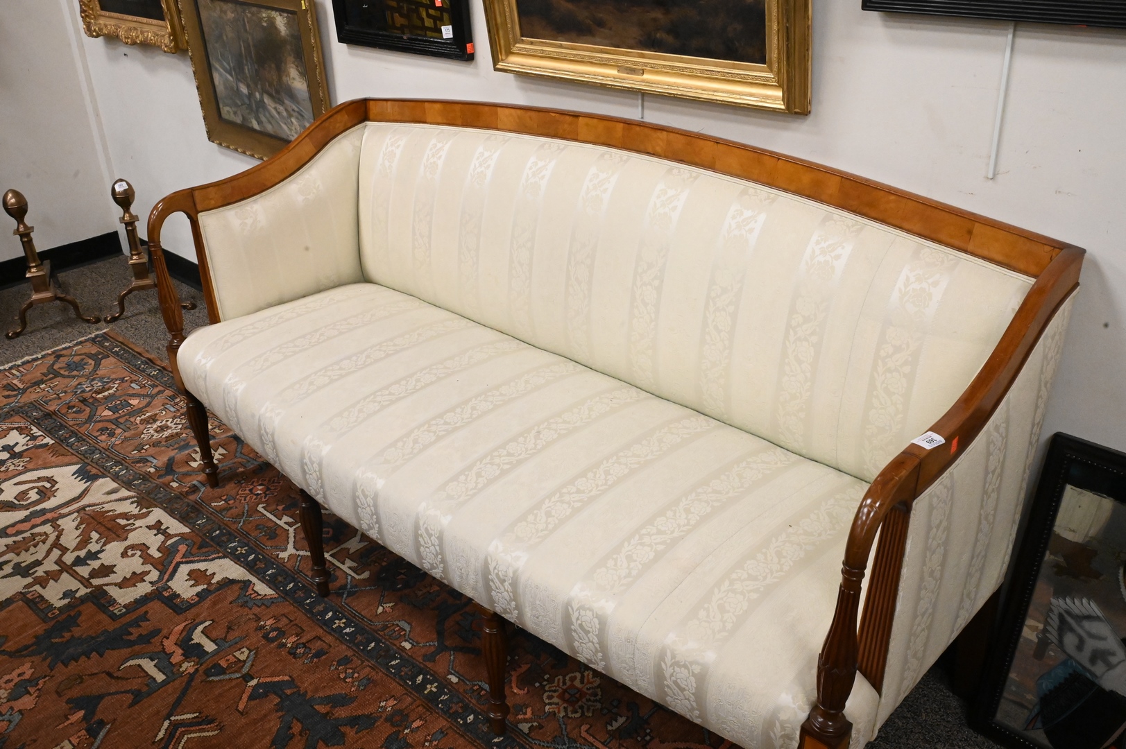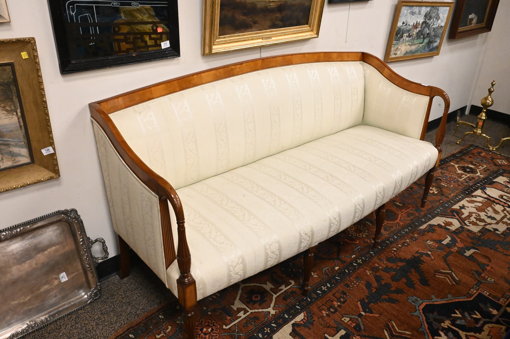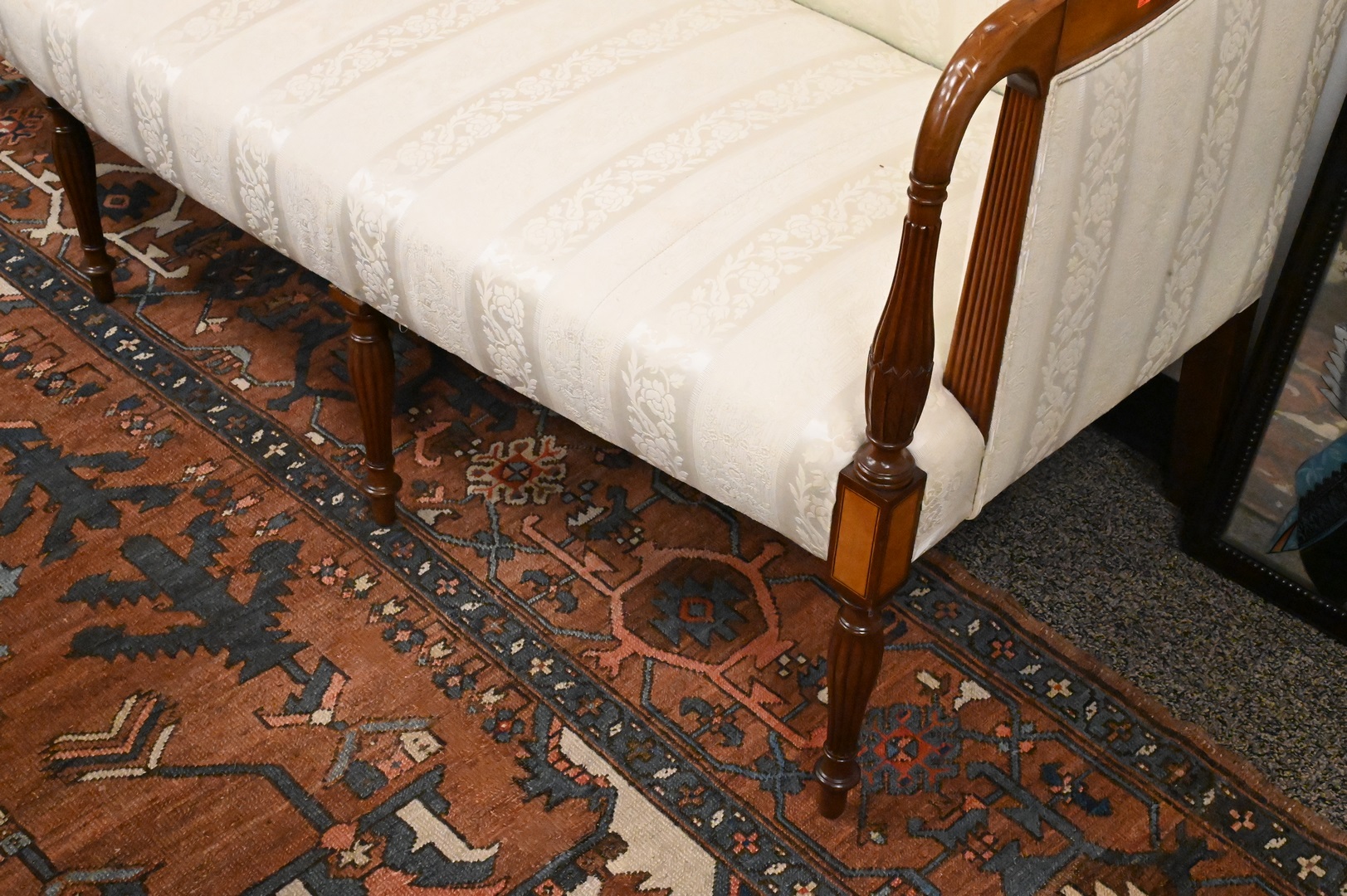 Sheraton Mahogany Sofa, having maple panel inlaid fluted legs, height 36 inches, length 70 inches. Provenance: Estate of Peter Tillou, Litchfield, Connecticut.