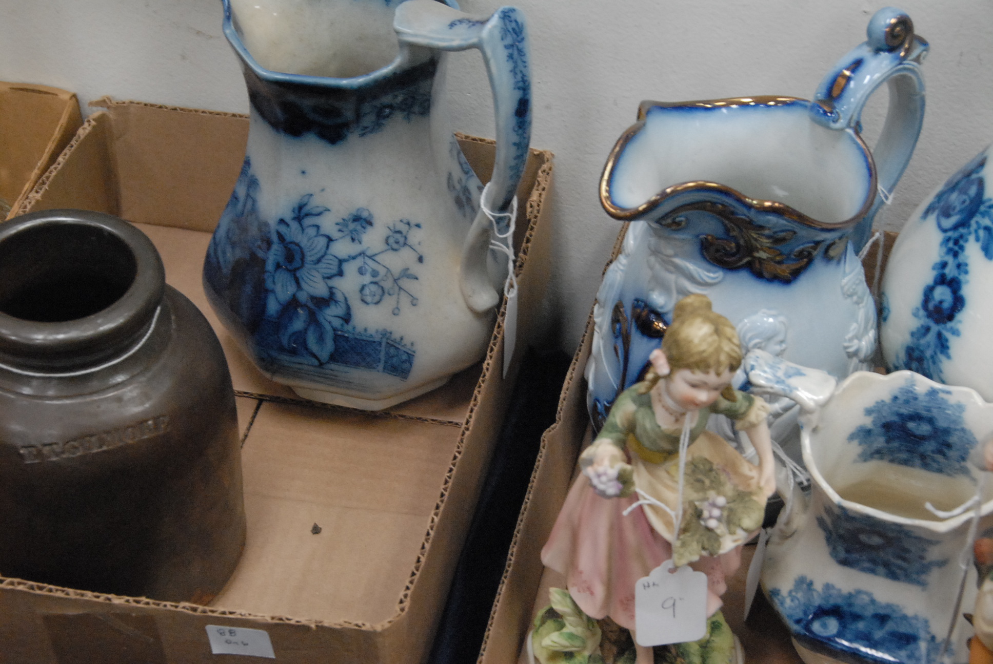 Lot 369: Three box lots four pieces of flow blue, stoneware, tobacco jars, Rockingham style cow creamer ear as is, two figures, etc.