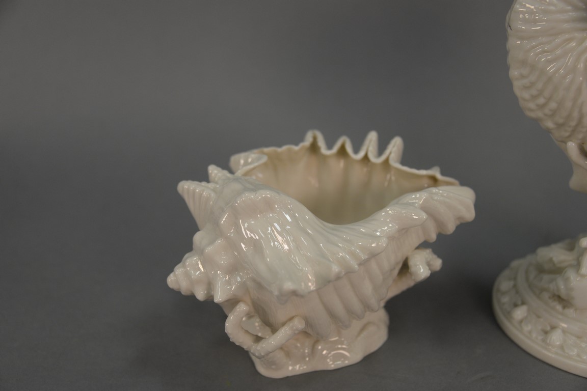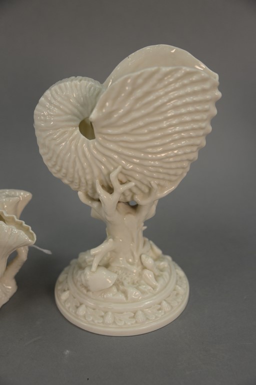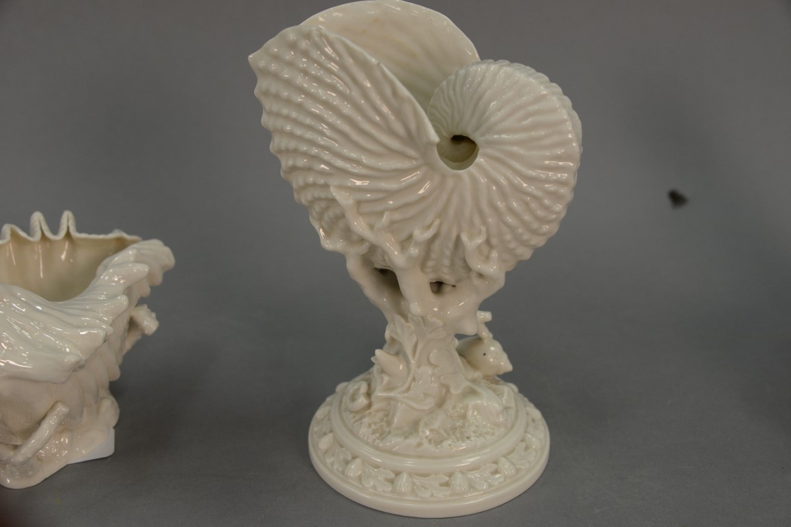 Lot 369: Two porcelain shell dishes, Royal Worcester Nautilus shell vase with green mark and a Belleek conch shell with black mark, ht. 4in.,…