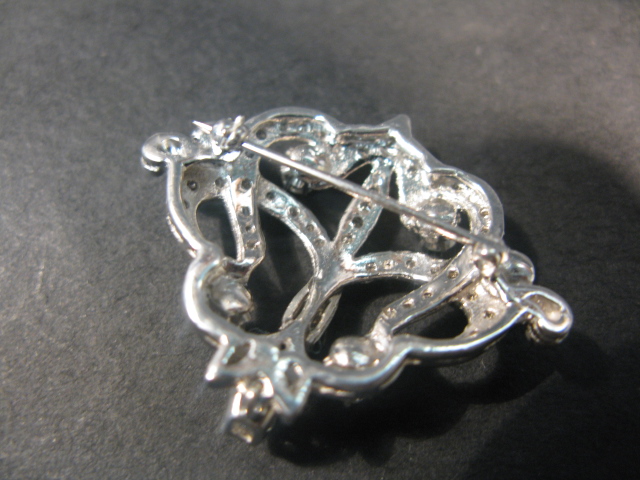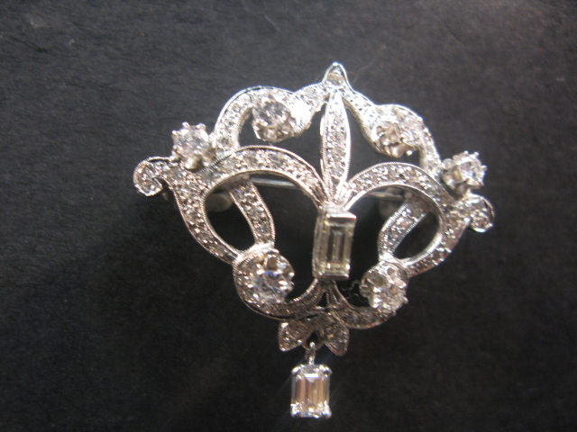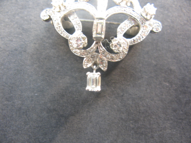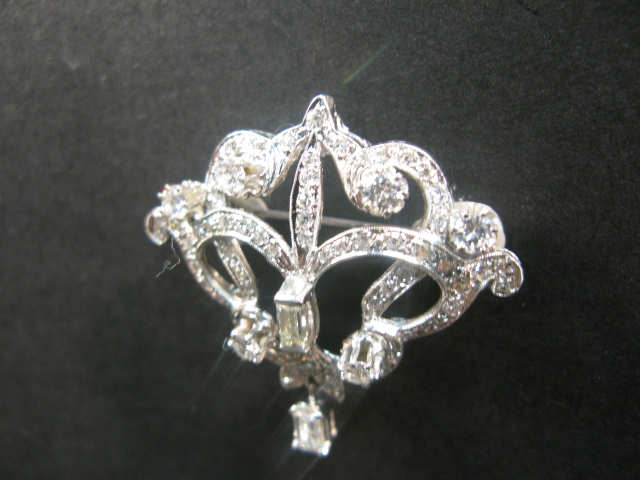 14K white gold and diamond pin set with two emerald cut diamonds, six round cut diamonds and encrusted with small diamonds.