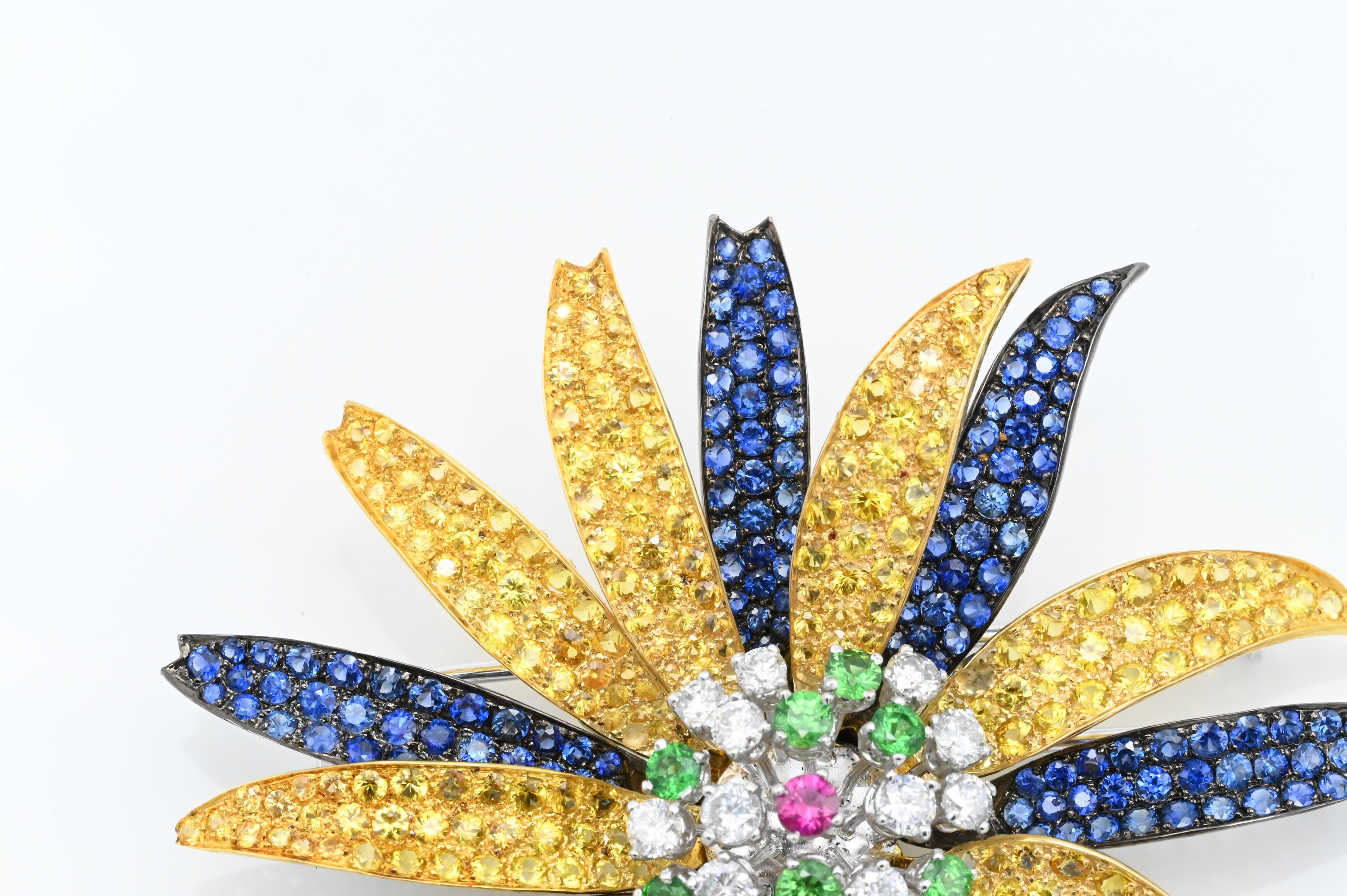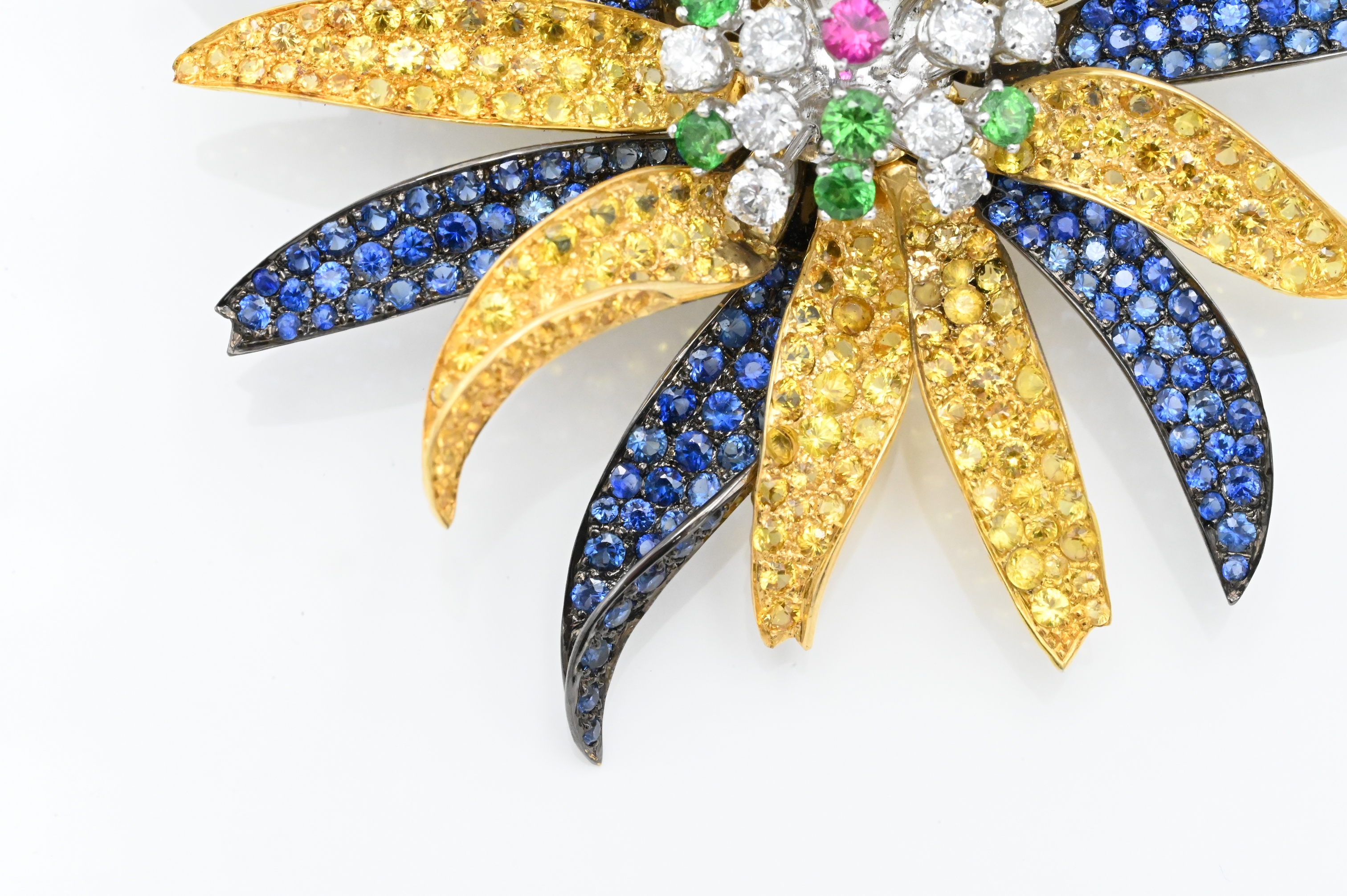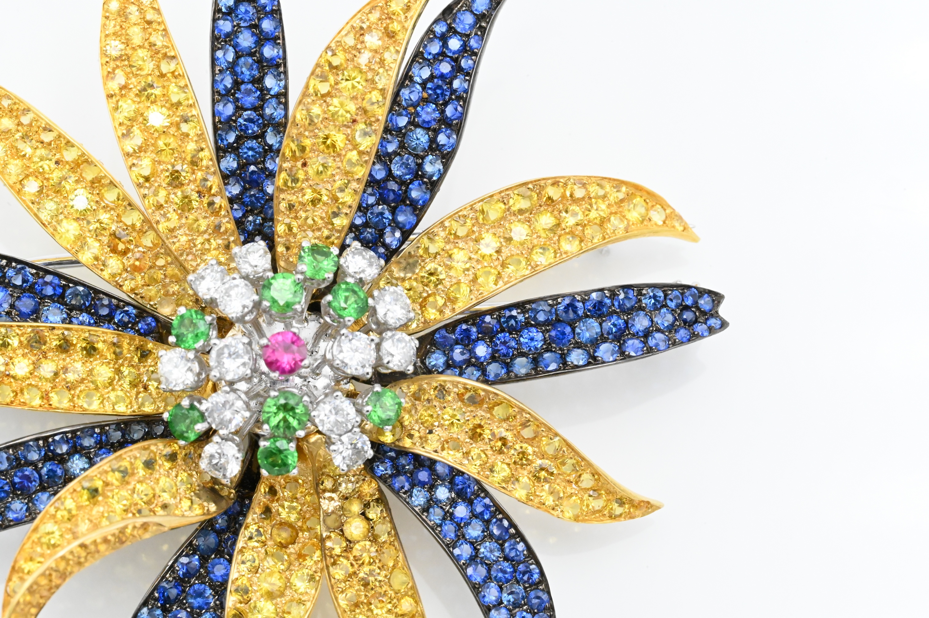 set with diamonds, emerald and ruby center, having black and gold petals set with yellow and blue sapphires
