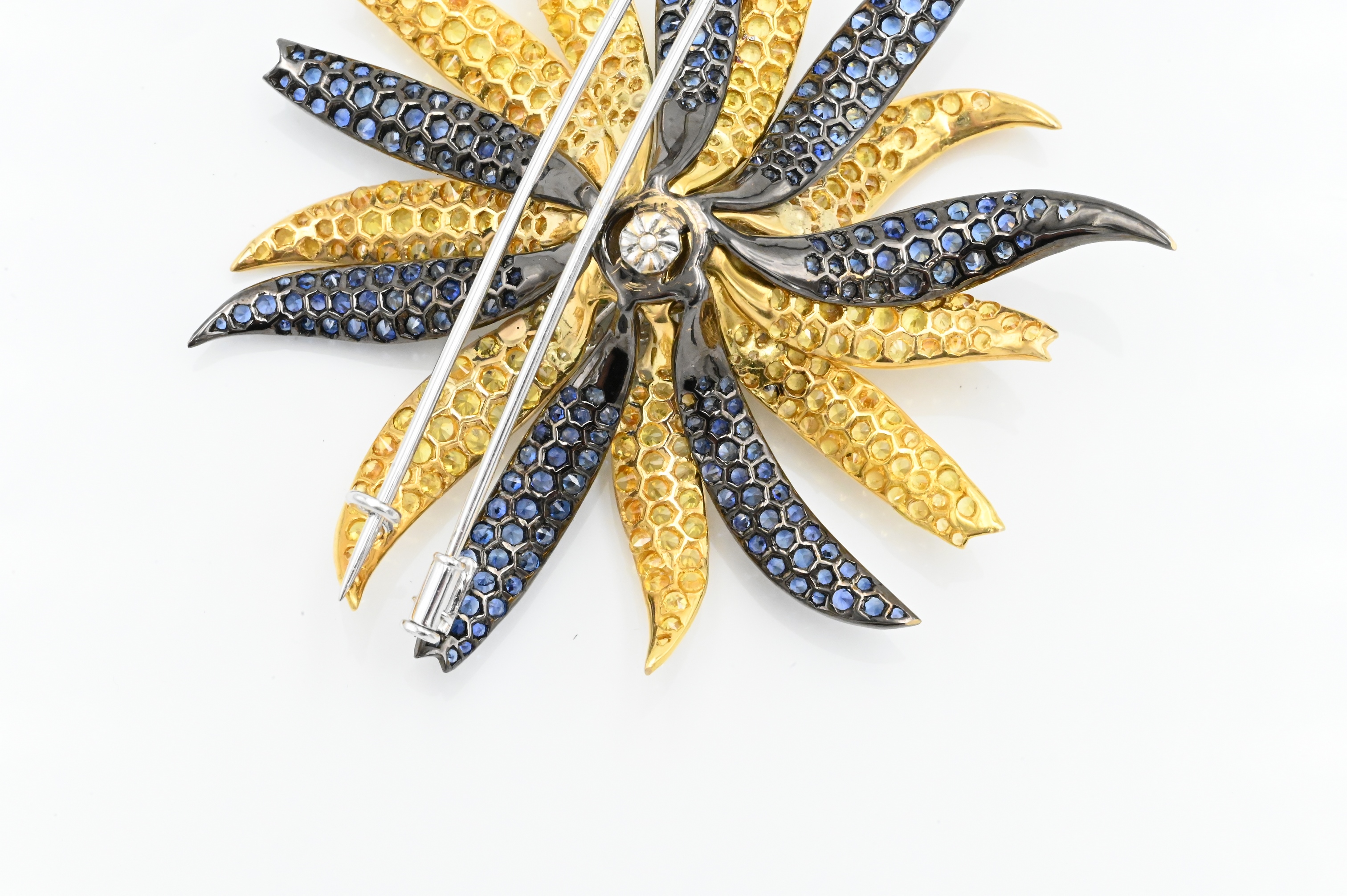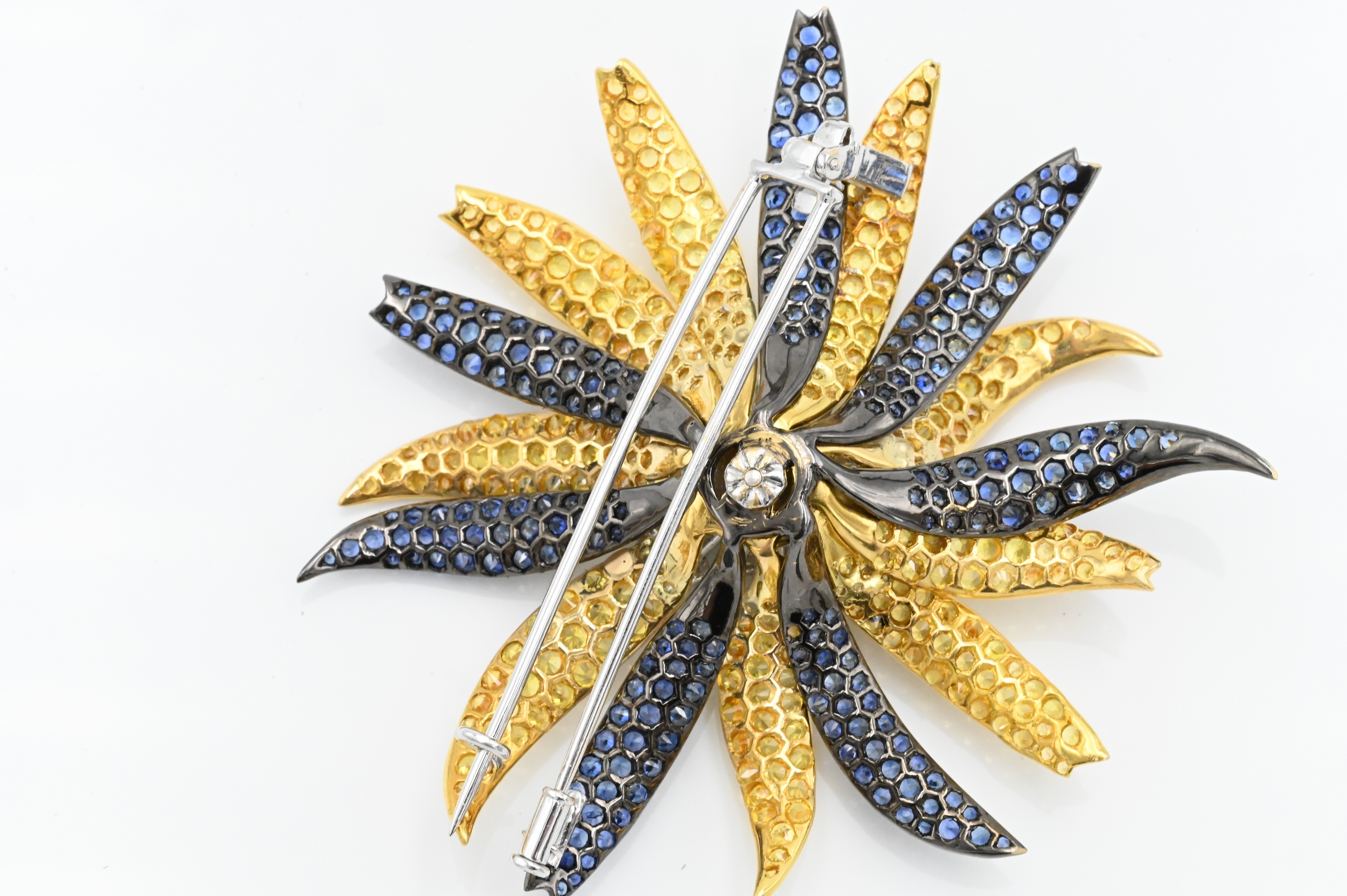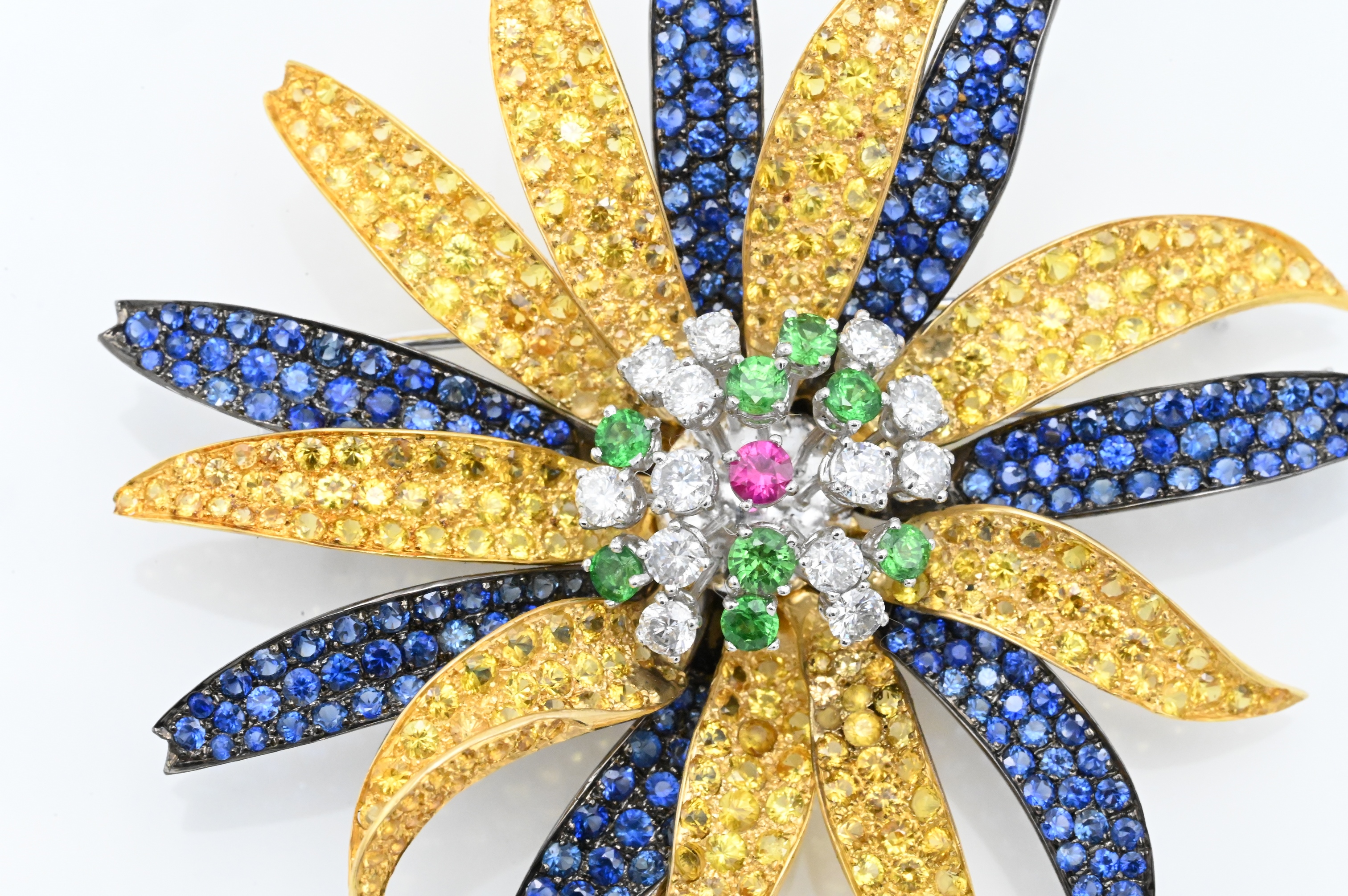 set with diamonds, emerald and ruby center, having black and gold petals set with yellow and blue sapphires