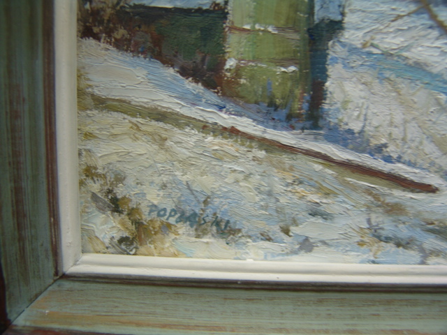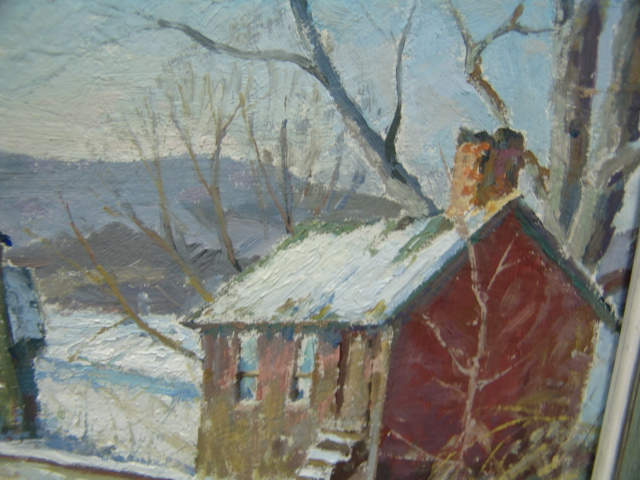 Alex Poplaski oil on board painting of snow scene with a red barn