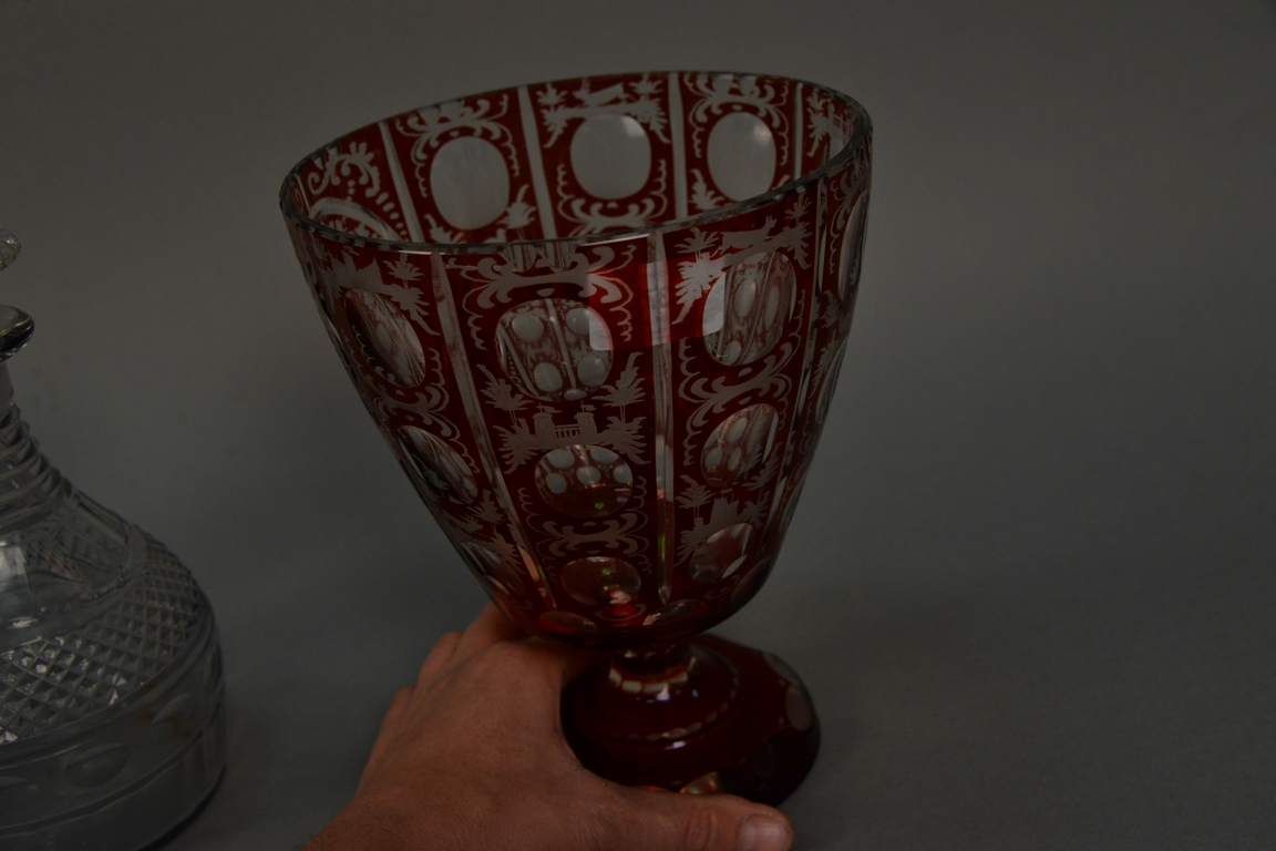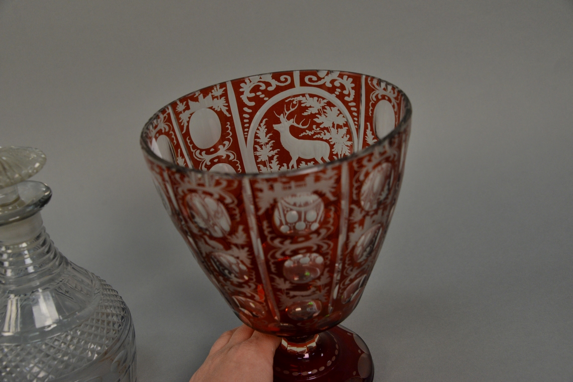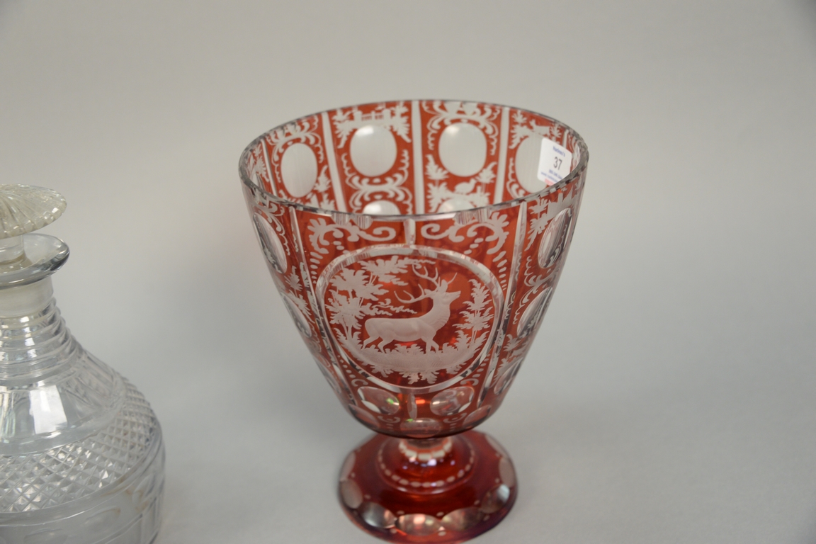 Bohemian ruby cut to clear glass vase etched with stag. ht. 9 1/4in.