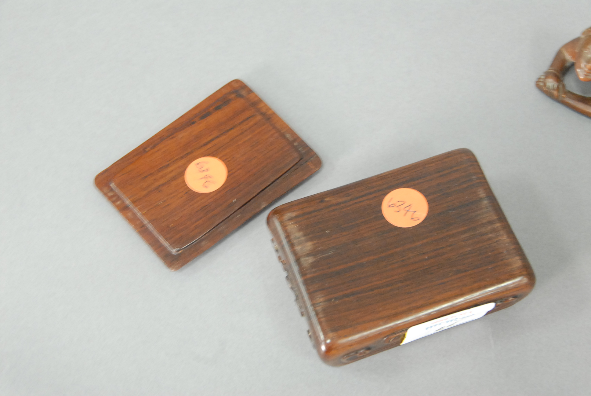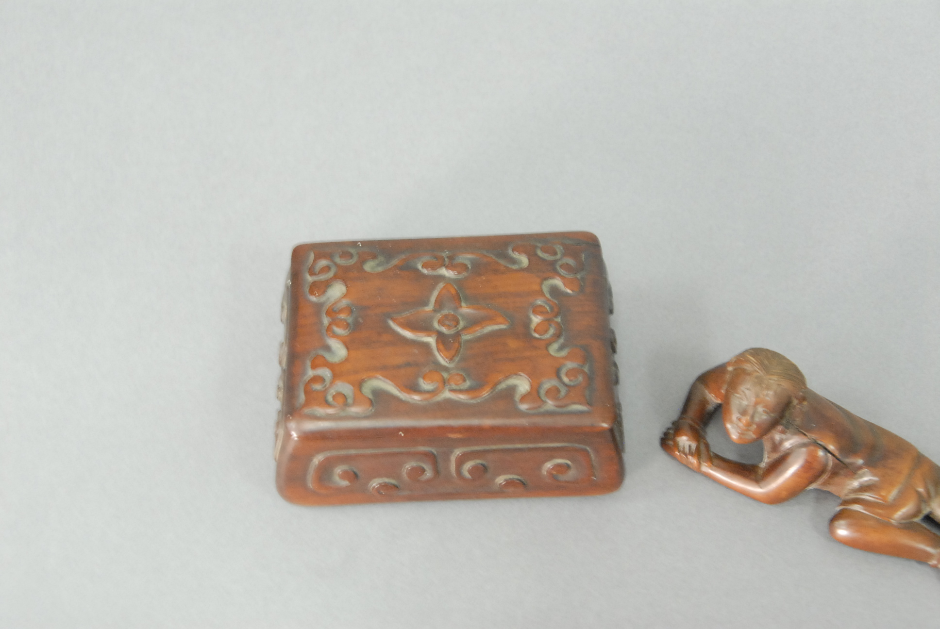Carved hardwood box along with a carved hardwood figure laying down, box: 3 1/2 x 2 3/4.