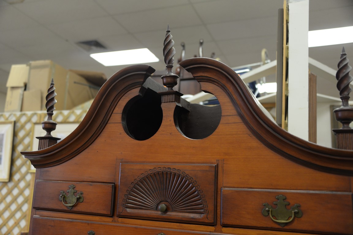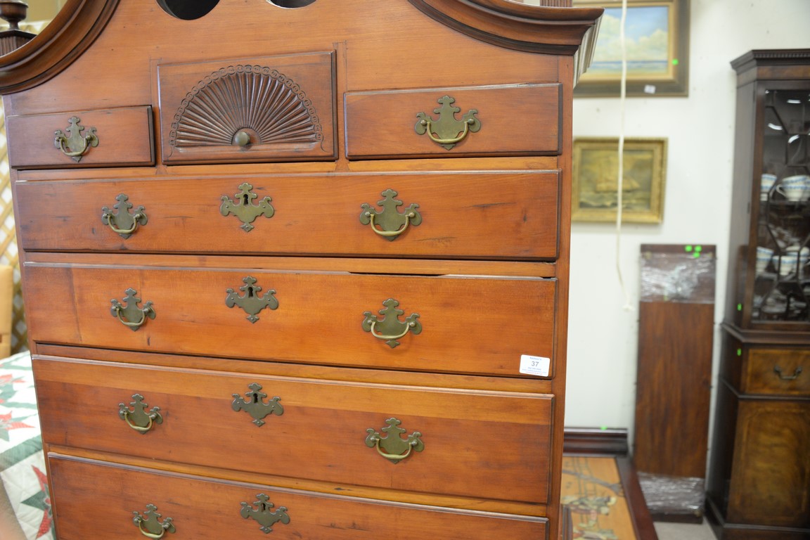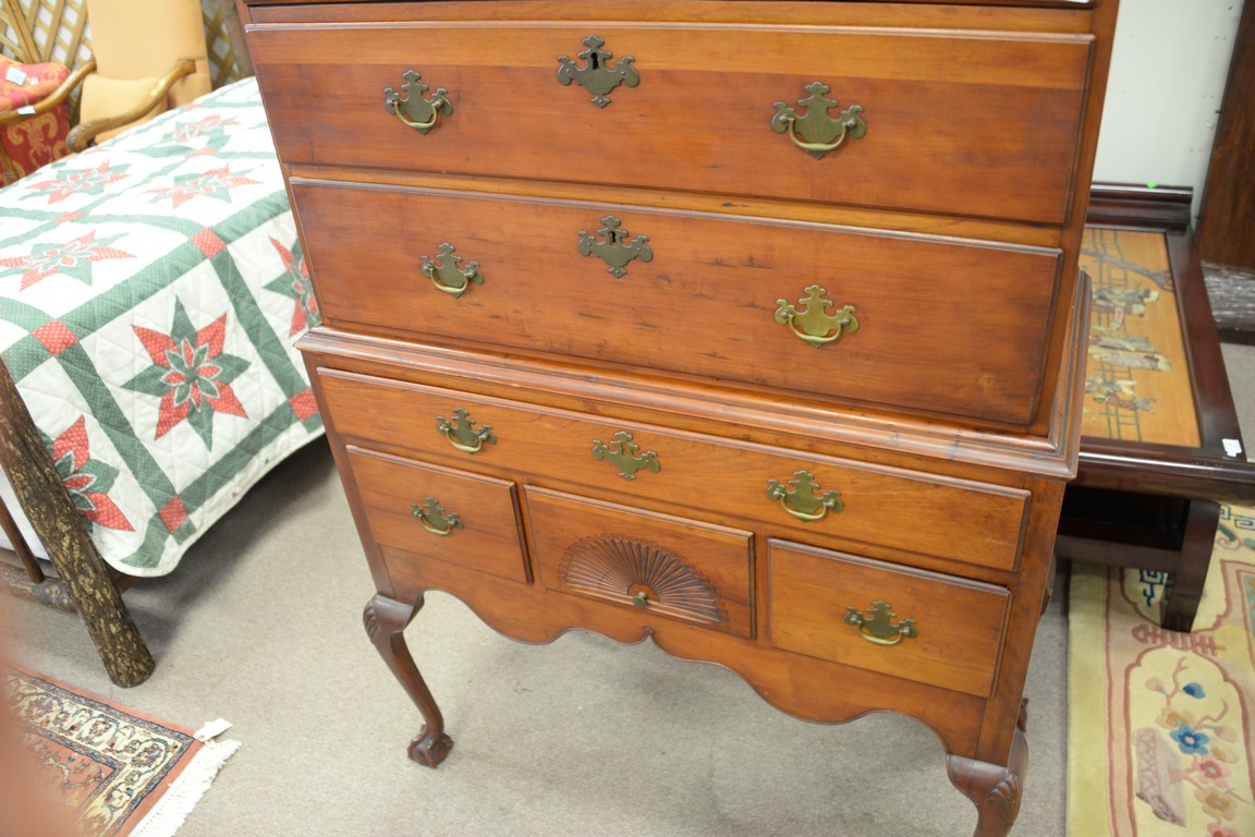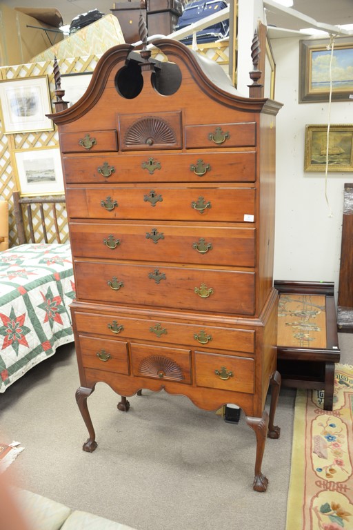 Lot 37: Chippendale cherry high chest in two parts, upper section with full bonnet top on lower section with carved skirt set on cabriole le…