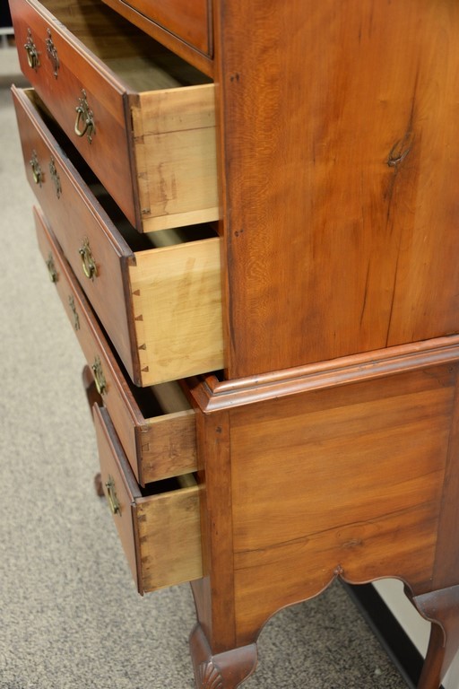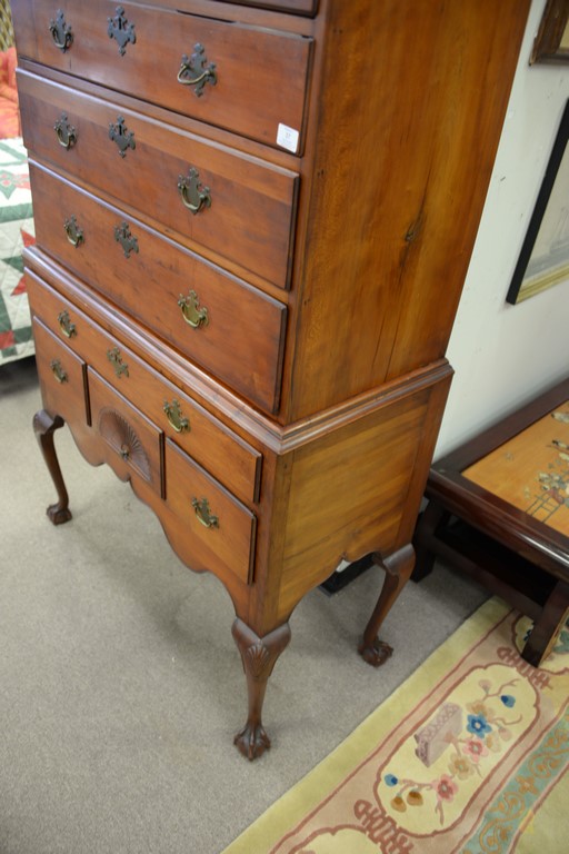 Chippendale cherry high chest in two parts, upper section with full bonnet top on lower section with carved skirt set on cabriole legs ending in ball and claw feet, circa 1760, married. ht. 85in., upper section wd. 36in., dp. 18in.