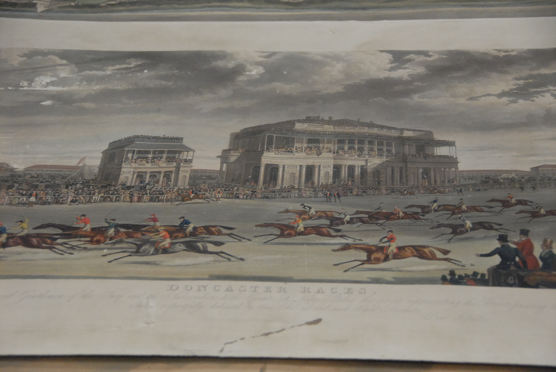 Lot 37: Early racing prints, Doncaster Races, The Winning Post, and Tattenham Corner, 13 1/2 x 24, 17 x 30, and 17 x 30.