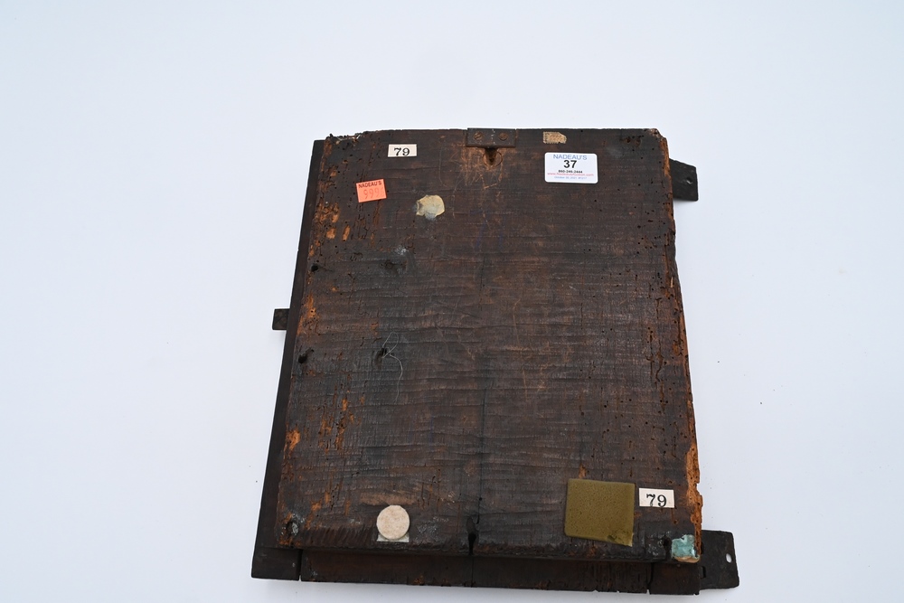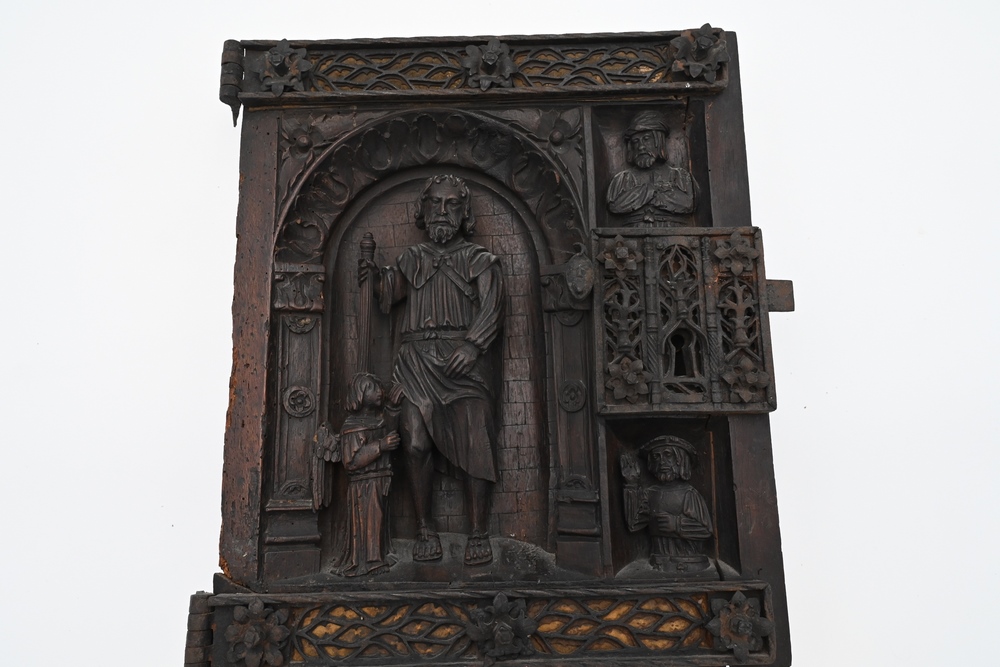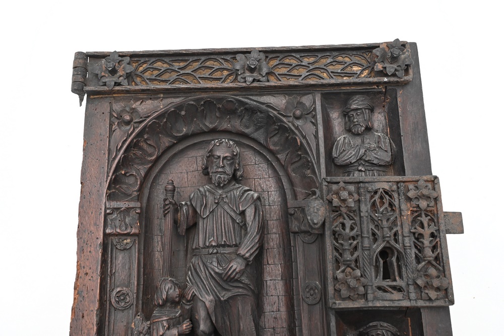Lot 37: French Iron Mounted 3D Carved Walnut Door Panel depicting Saint Roch with an angel at his side, two busts to the right, pierced ironwork hinges and lock, sliding arm bolt 16th century or later height 13 1/2 inches, width 11 inches