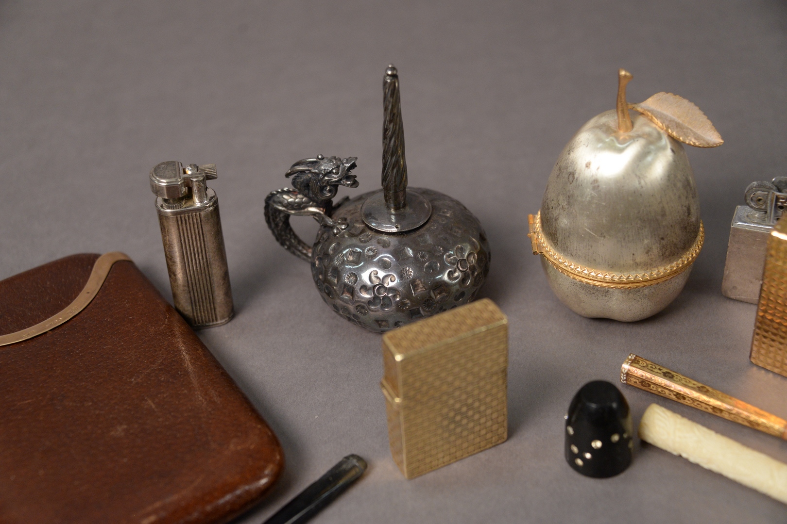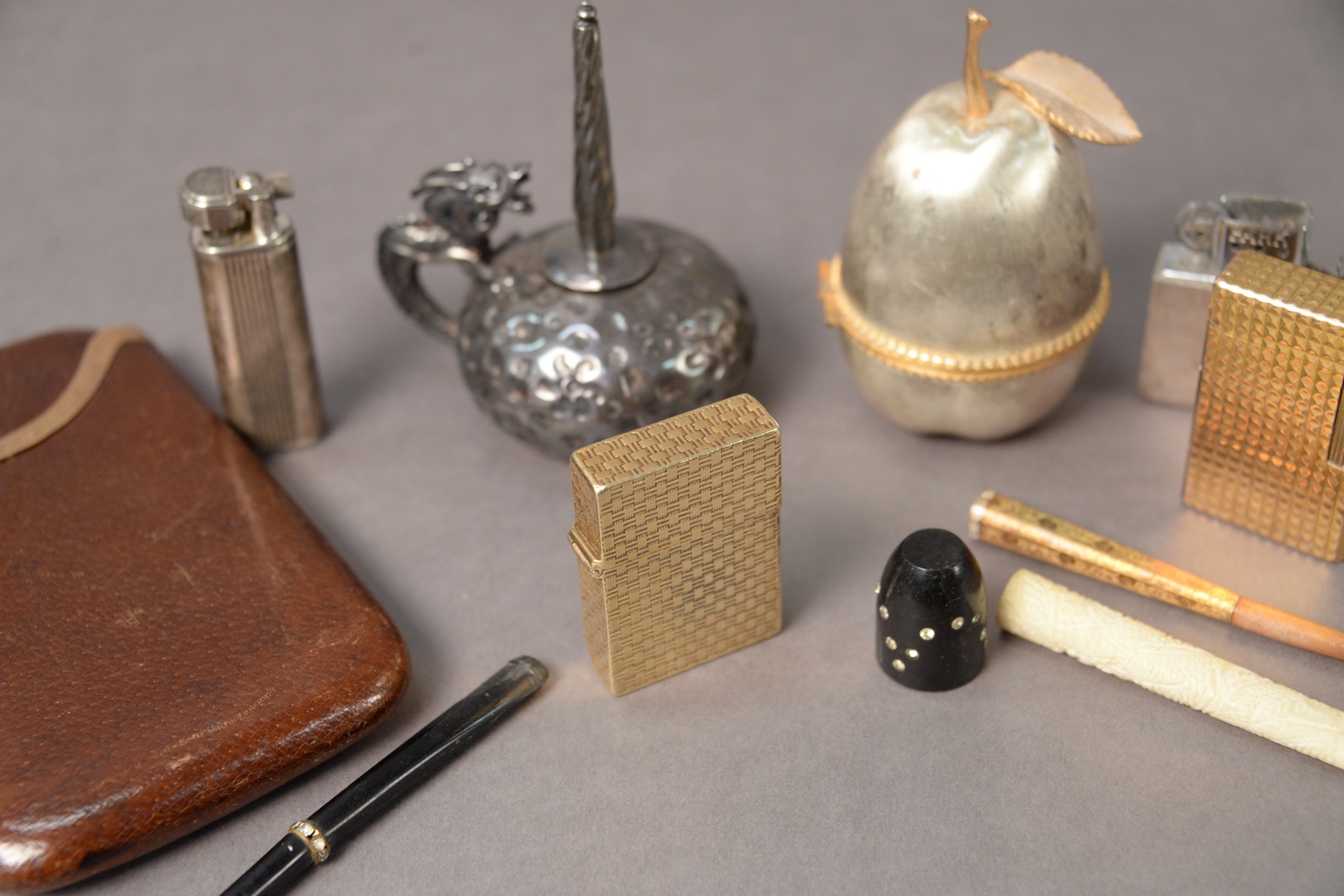 Lot 37: Group of Assorted Items, to include silverplate dragon oil lamps leather case with Asprey, London gold edge Dupont lighter pear form lighter gold lighter case along with two other lighters.