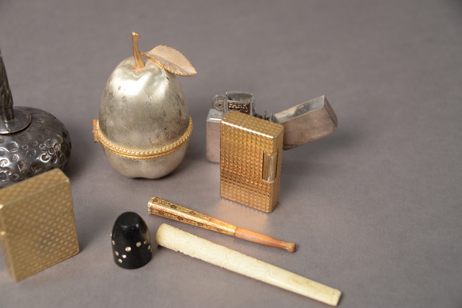 Group of Assorted Items, to include silverplate dragon oil lamps leather case with Asprey, London gold edge Dupont lighter pear form lighter gold lighter case along with two other lighters.