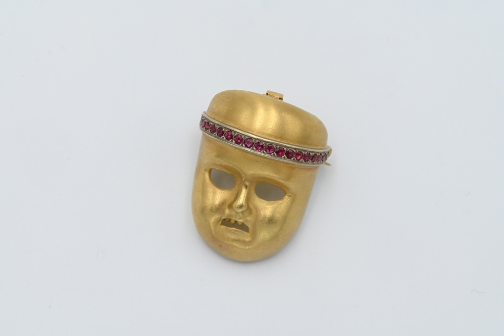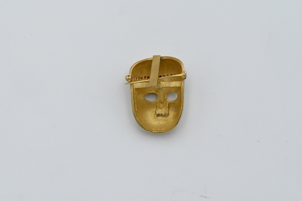 Lot 37: Kieselstein-Cord 18 Karat Gold Mask, having line of 19 rubies, height 1 3/8 inches, 27 grams.