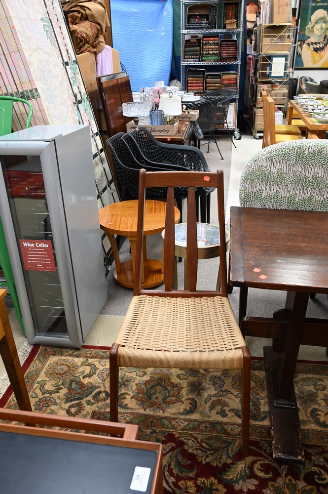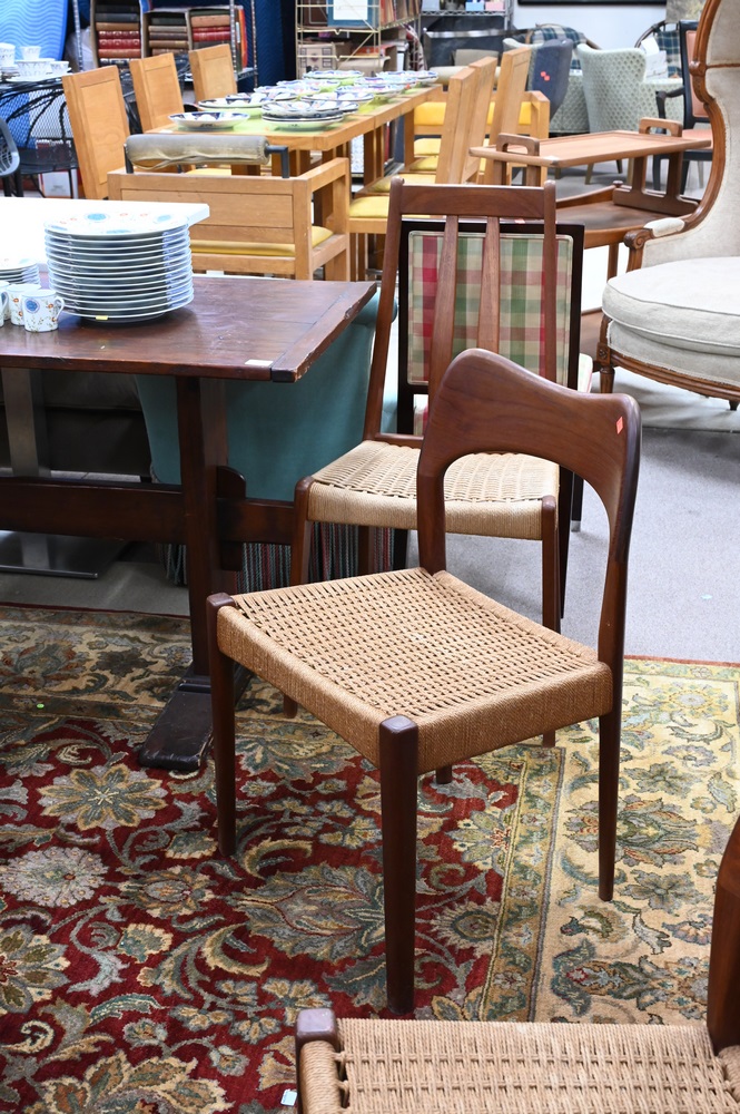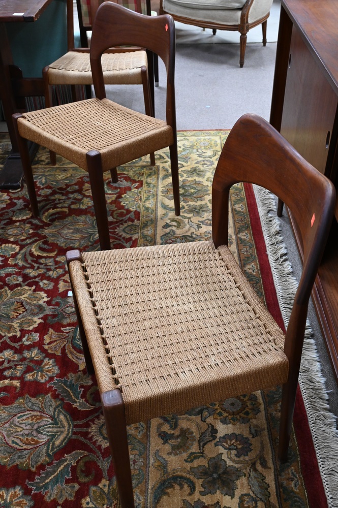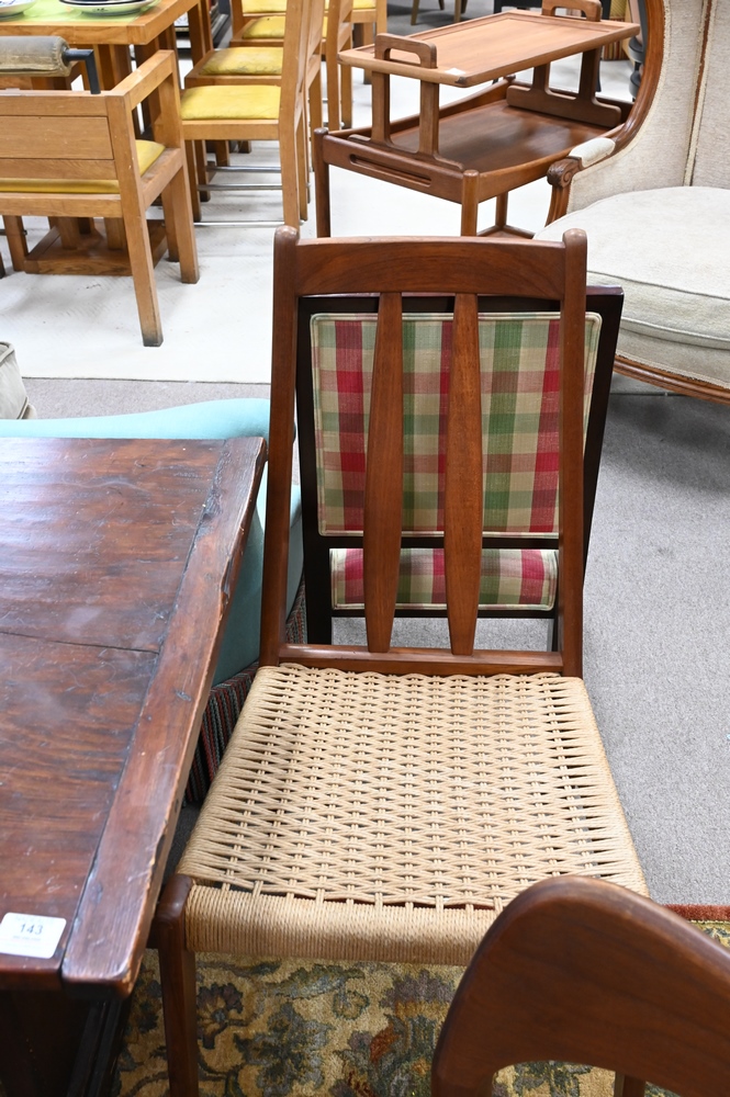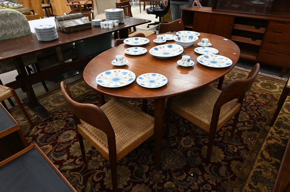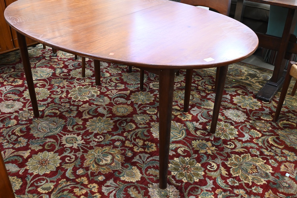 Lot 37: Nine Piece Danish Modern Kofod Larsen Dining Set, to include an oval table with two leaves and six chairs, along with two additional extra chairs, height 29 inches, top 59″ x 40″.