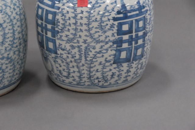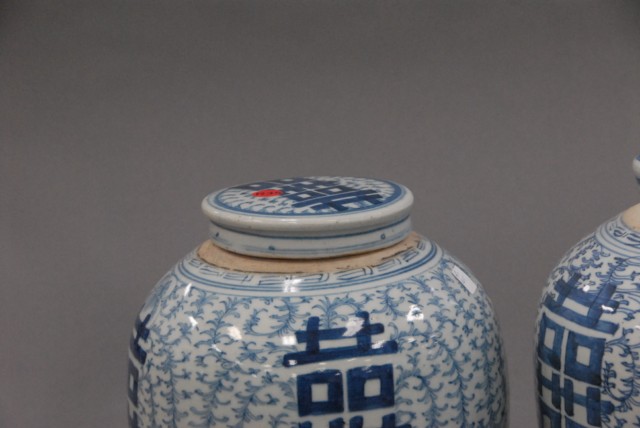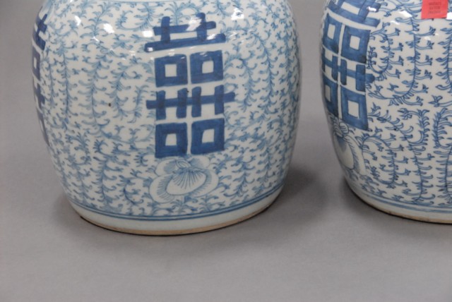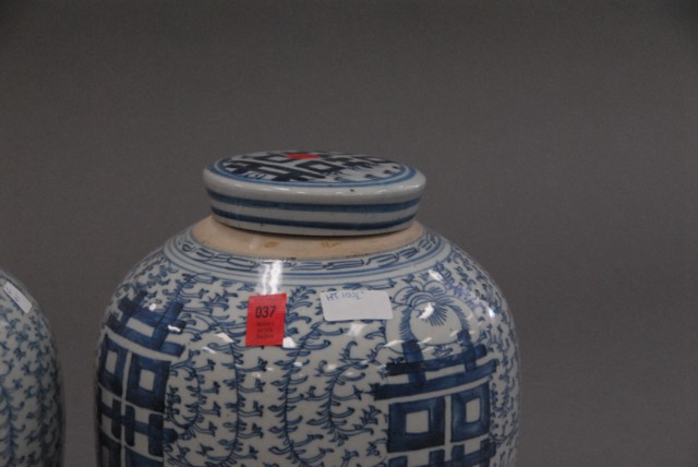 Pair of blue and white covered jars.