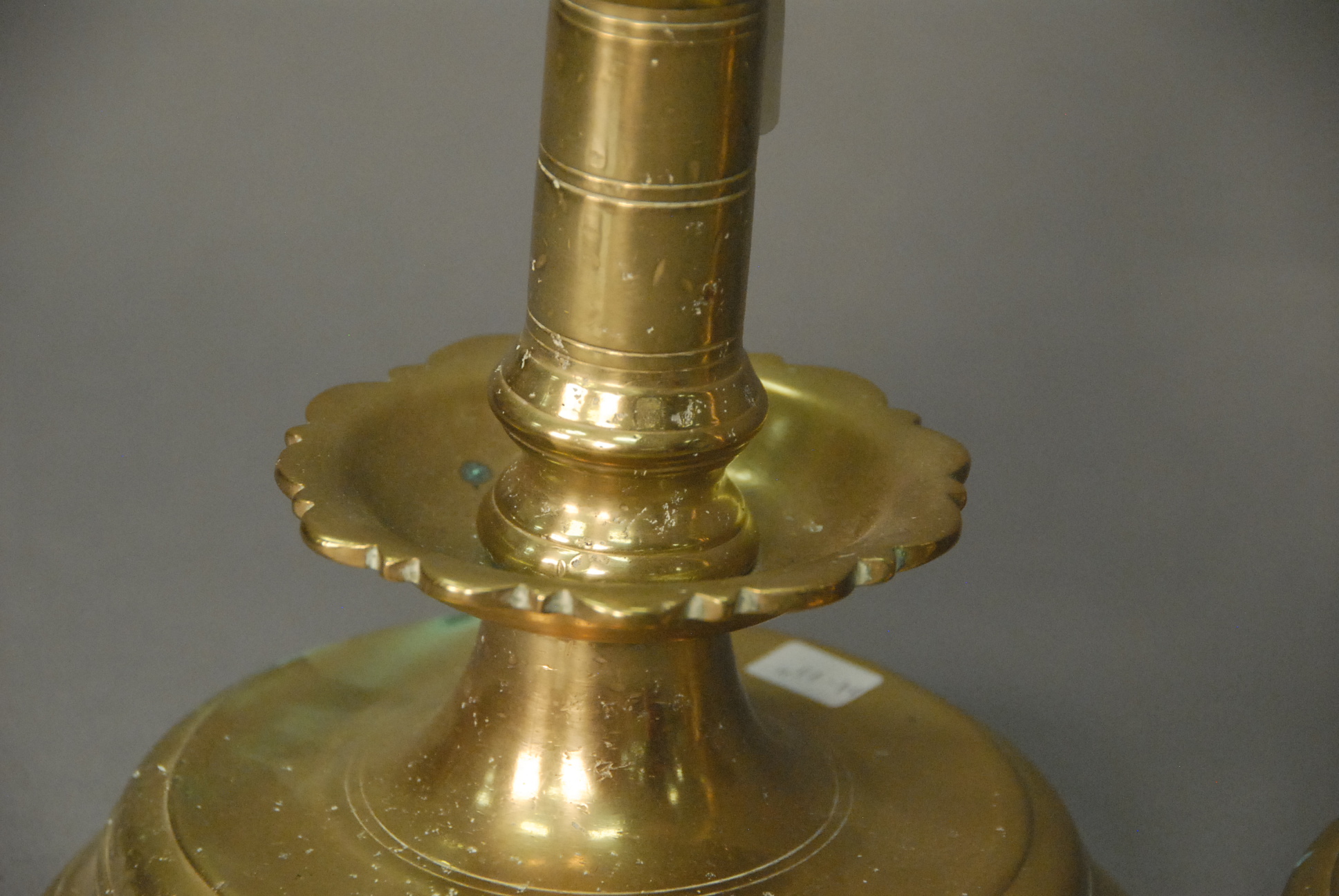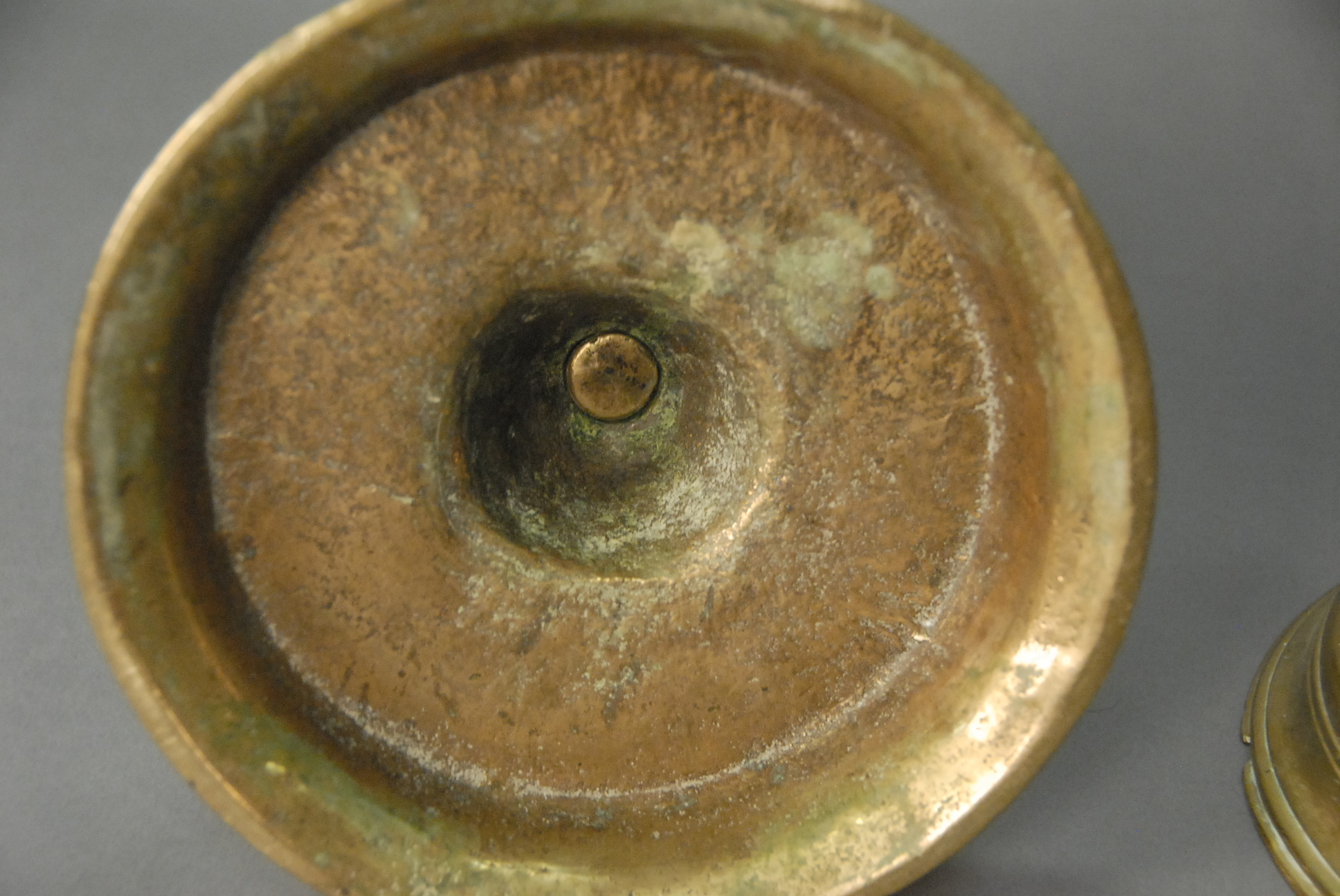 Pair of heavy brass candlesticks with shaped drip catchers, 17th – 18th century. ht. 11 in. Provenance: Property from a Private Collection Sold for the Benefit of the Virginia Historical Society.
