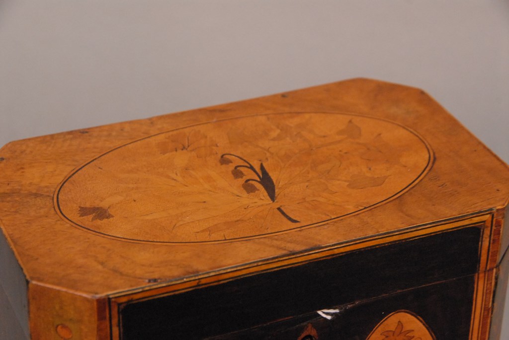 Tea box, eight sided with oval panel inlay with urns and flowers. ht. 5in.