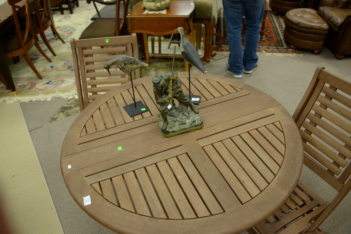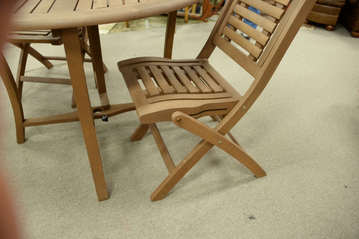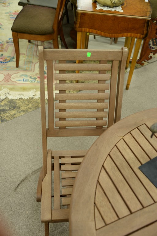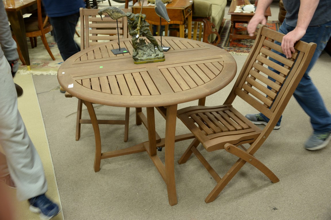 Lot 37: Teak three piece outdoor table set including pair of folding chairs and folding round table, ht. 30in., dia. 43in.