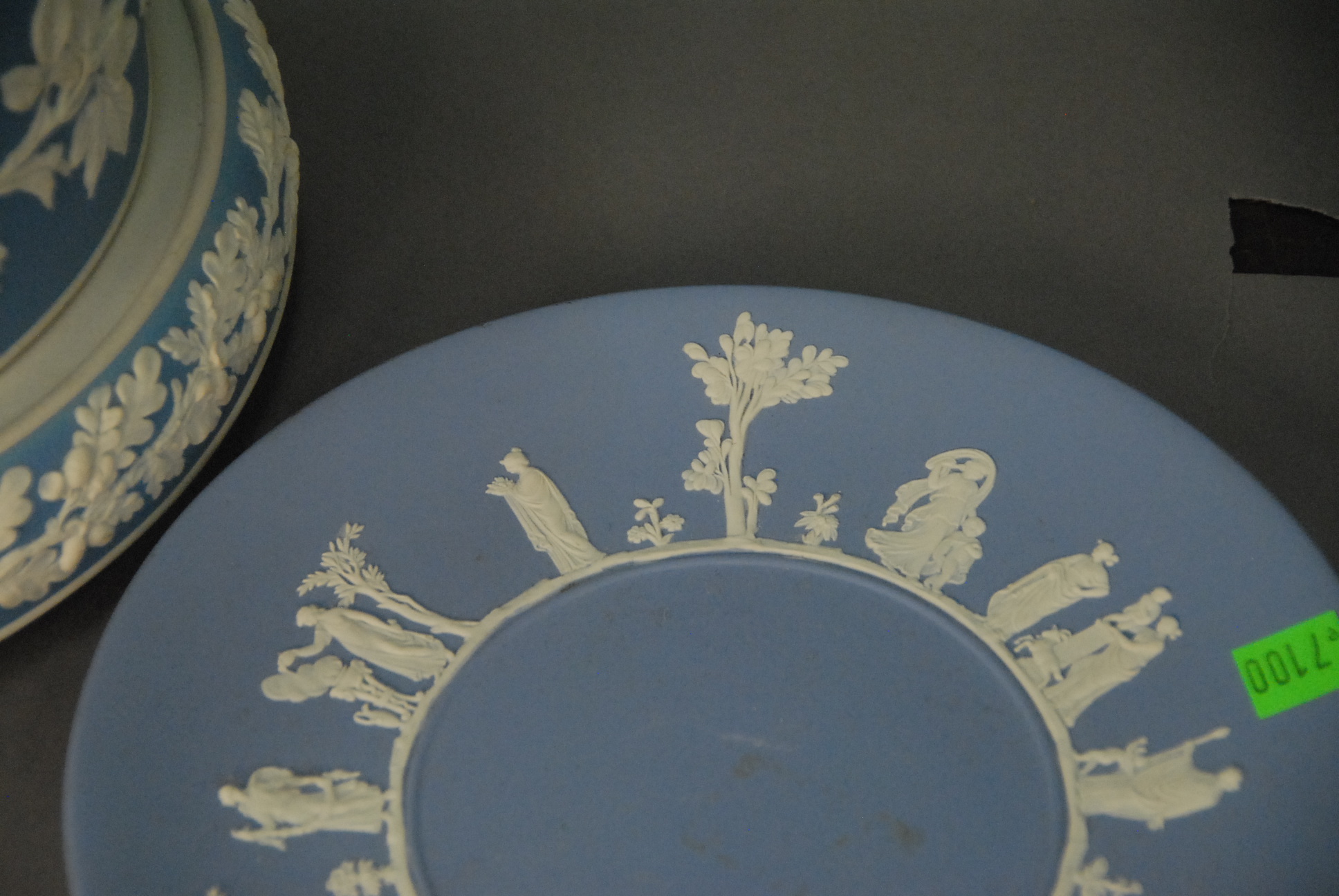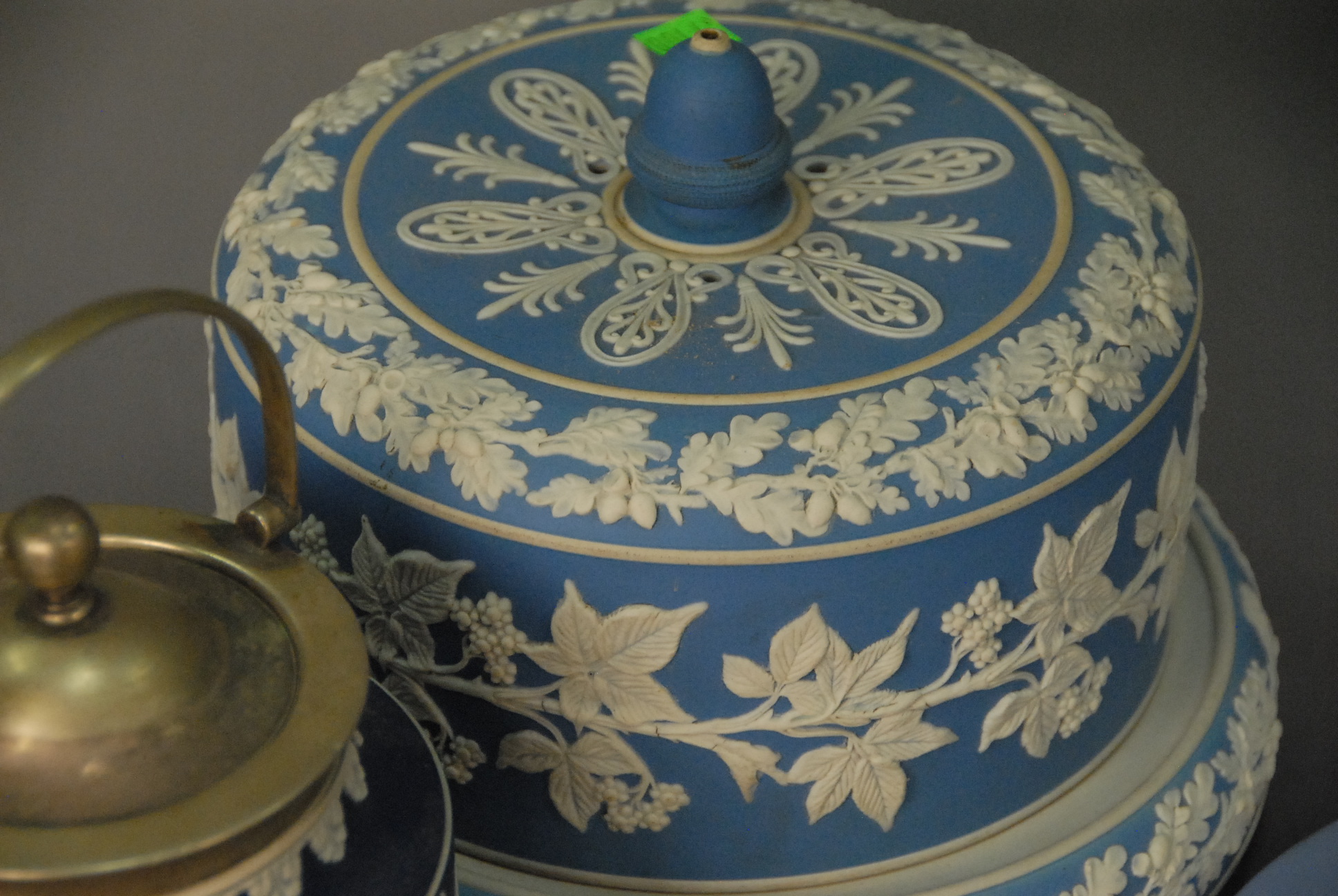 Lot 37: Three Jasperware dishes including a cheese bell dome, Adam’s cookie jar, and Wedgwood cake plate.