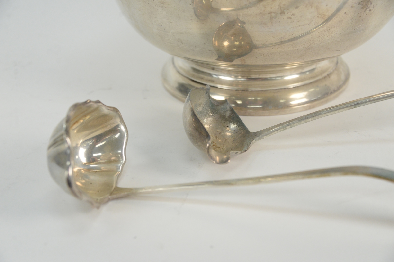 Three Piece Group of Sterling Silver to include a large Gorham Revere style sterling bowl, height 7 5/8 inches, diameter 14 inches along with a pair of ladles, length 14 inches, 89.8 t.oz. all having pitting Provenance: From a Newport, Rhode Island historic home, in the same family since 1761.