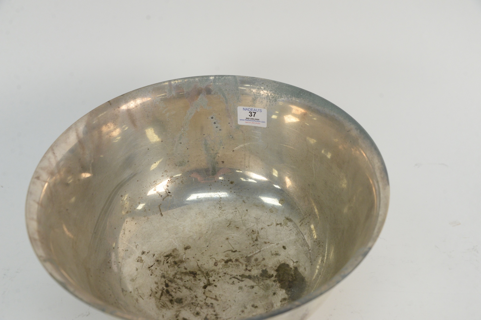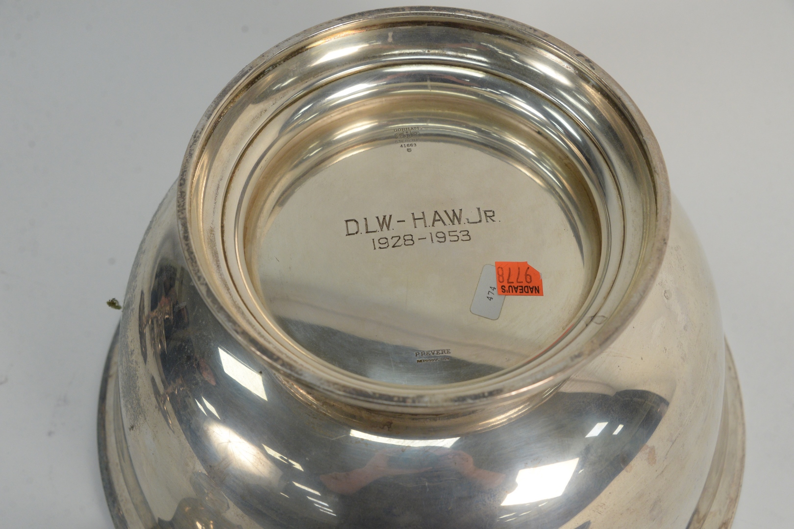 Lot 37: Three Piece Group of Sterling Silver to include a large Gorham Revere style sterling bowl, height 7 5/8 inches, diameter 14 inches along with a pair of ladles, length 14 inches, 89.8 t.oz. all having pitting Provenance: From a Newport, Rhode Islan