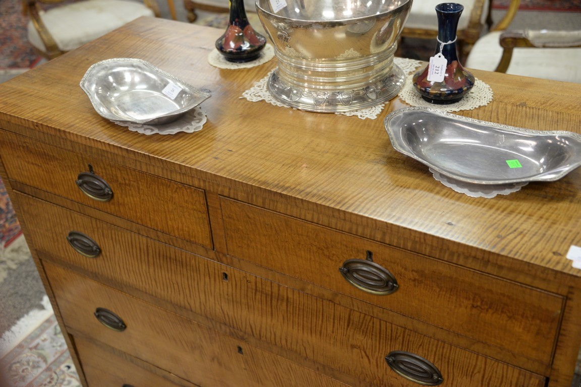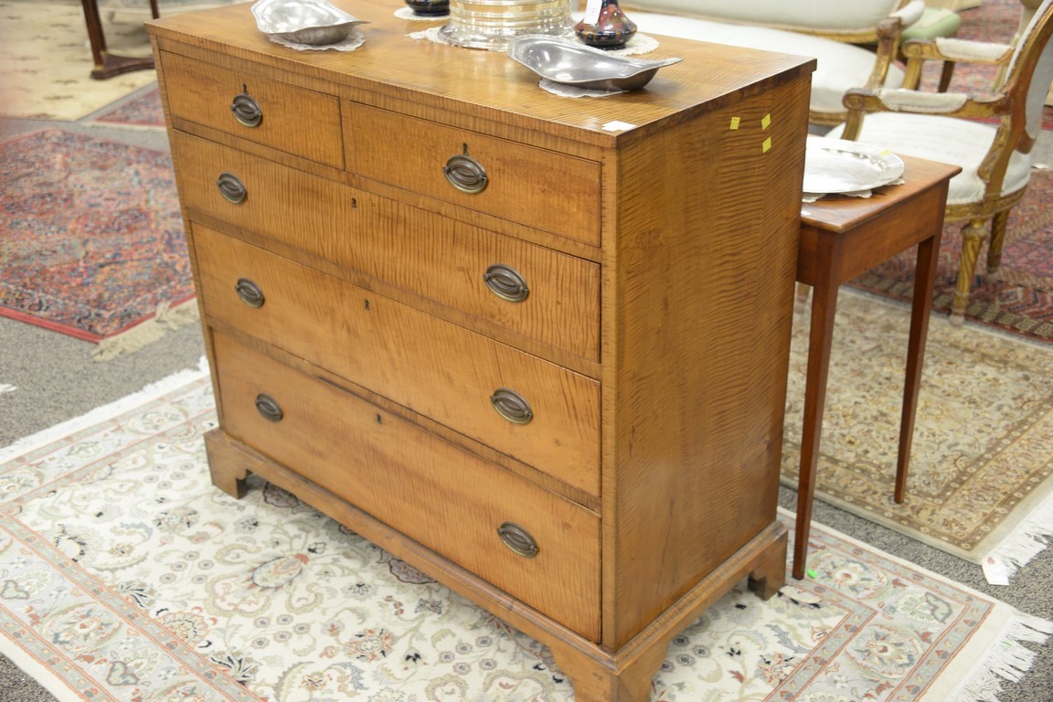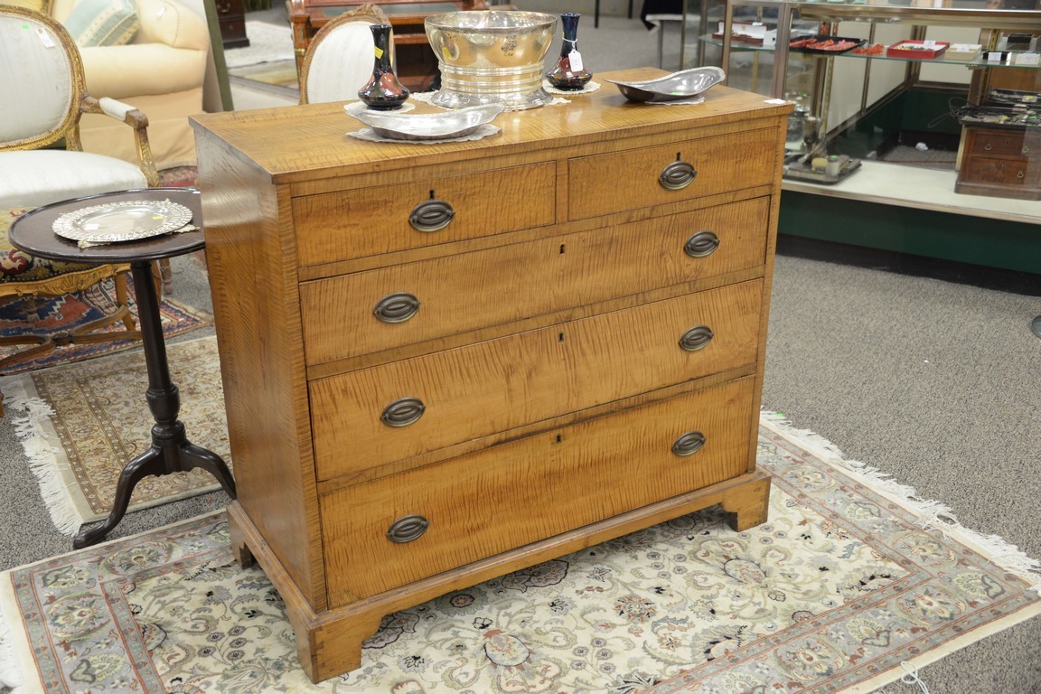 Lot 37: Tiger maple Chippendale two over three drawer chest restored. ht. 39in., wd. 43in., dp. 19in.