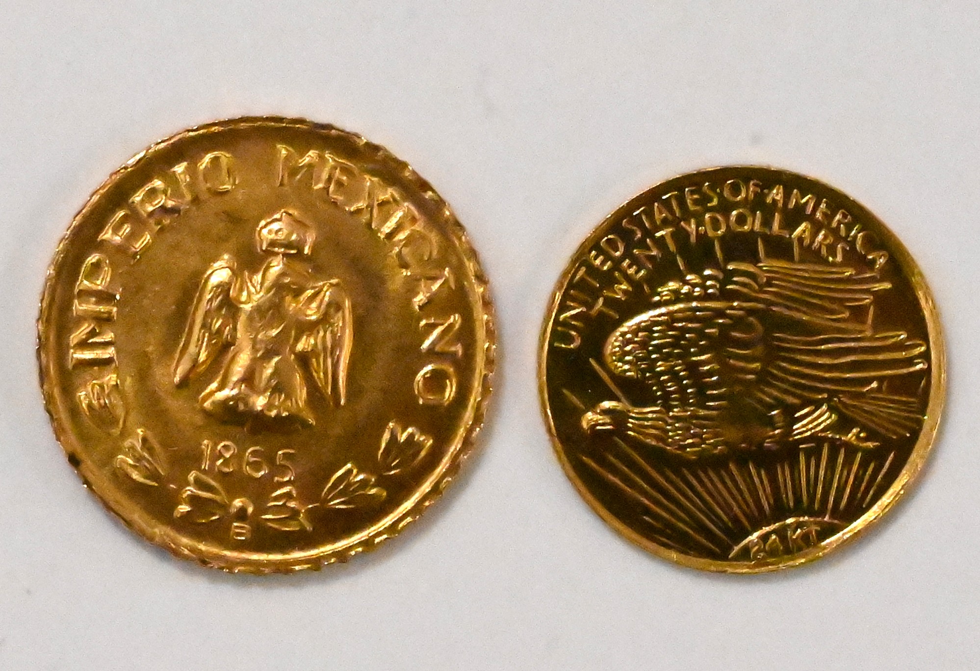to include Columbia Mint mini St. Gaudens $20 replica 24 karat .3 grams, and 1865 mini Maximiliano one peso .53 grams (1/50 oz of gold)