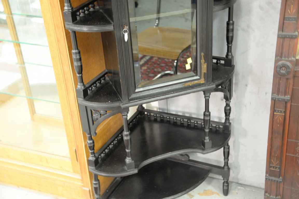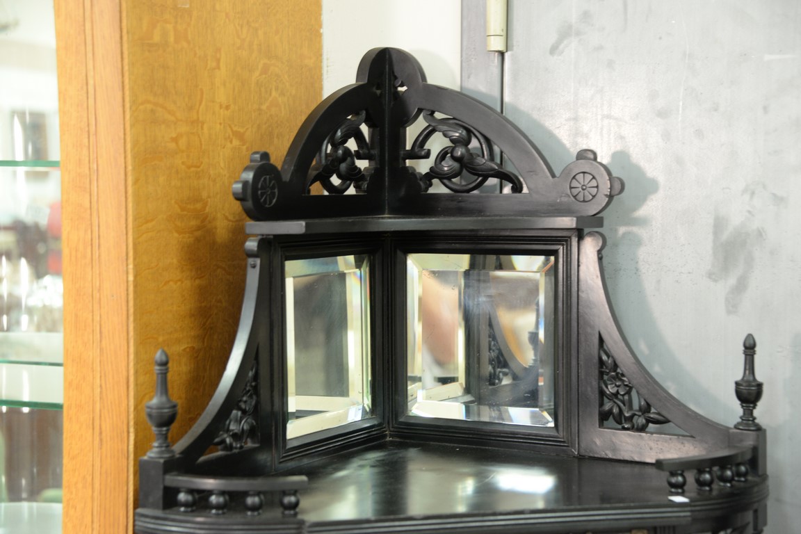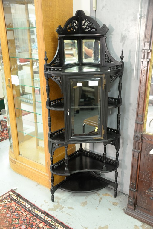 Lot 37: Victorian ebonized corner whatnut shelf with cabinet attributed to Kimbel & Cabus, circa 1880. ht. 69 in. wd. 26 in.