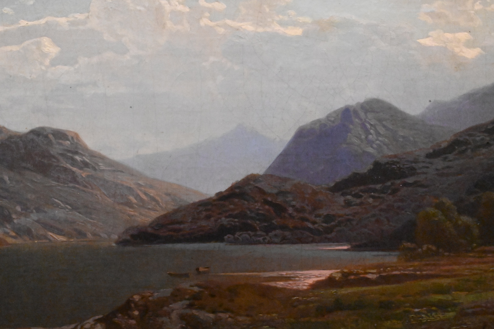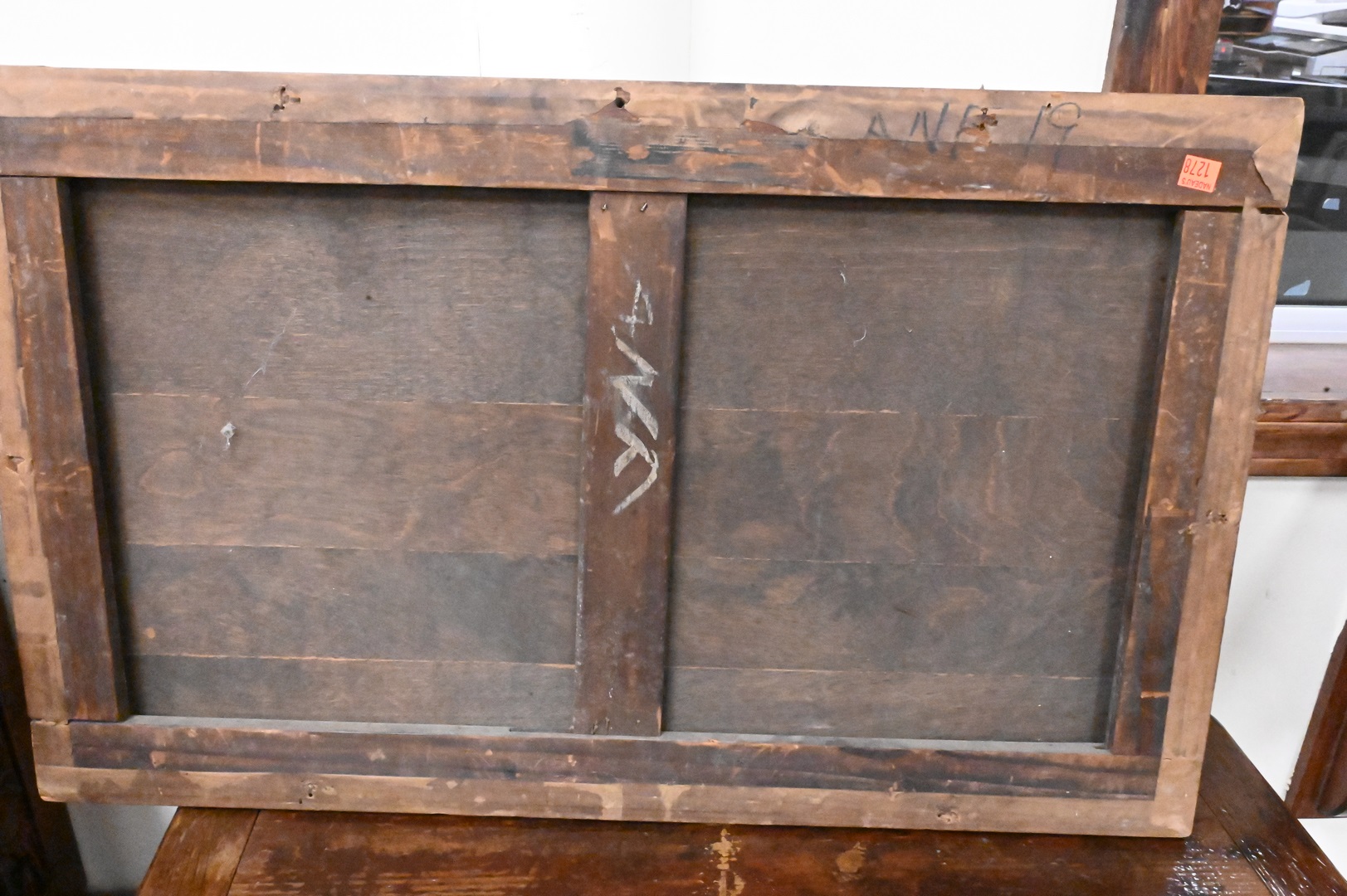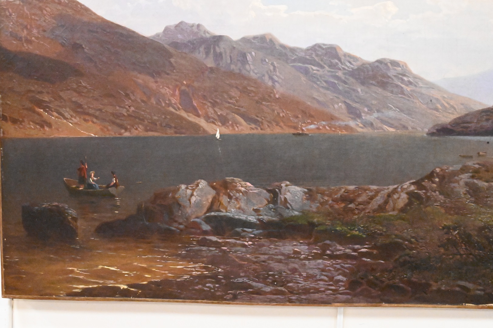 19th Century Continental River Landscape, oil on canvas laid on board, having figures in boat, along with tugboat/steam ship in background, 18″ x 29″.