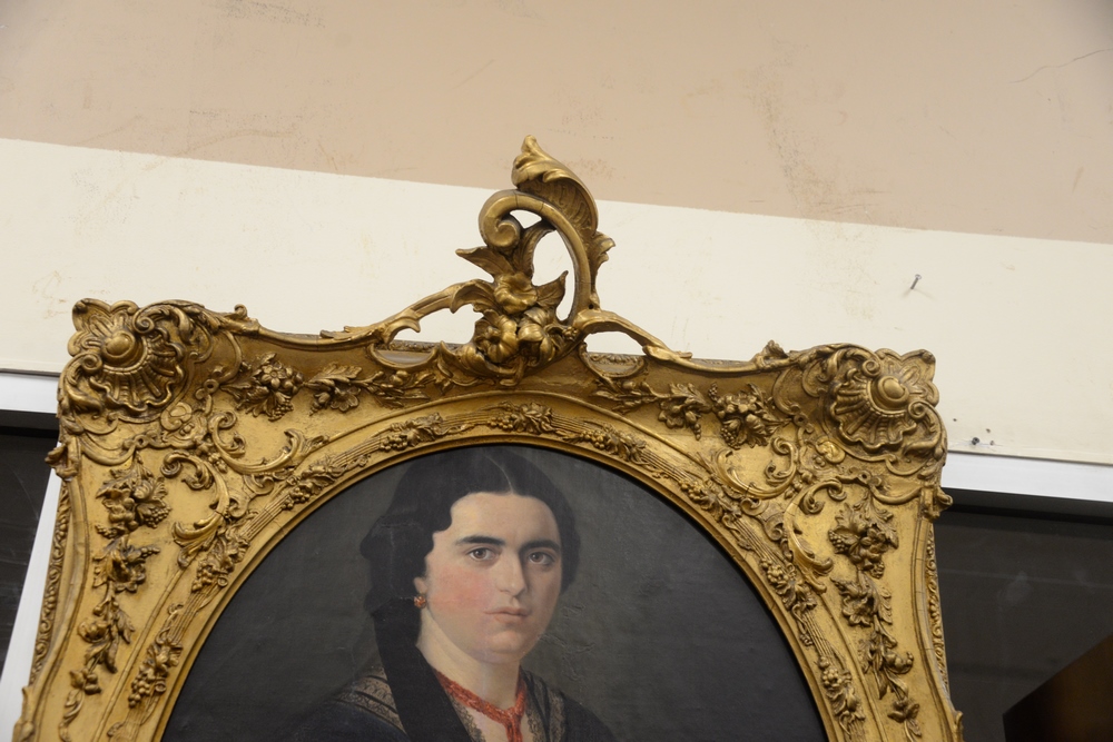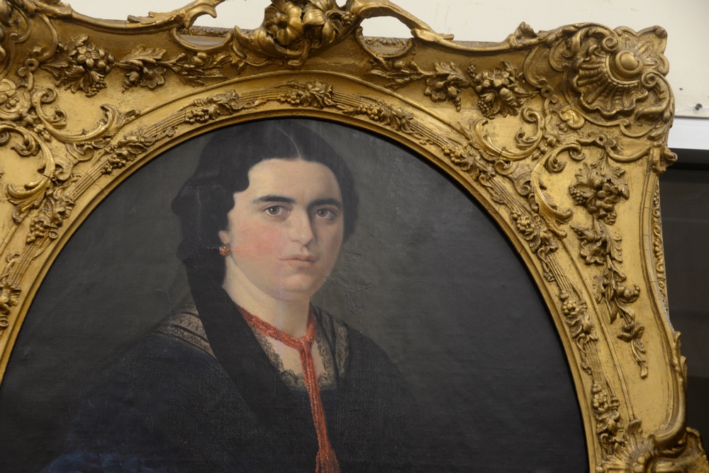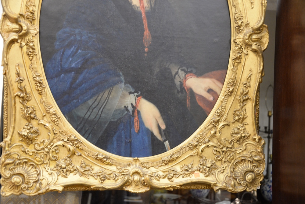 American School (19th Century), Victorian portrait of a woman in a dress with lace and red beaded jewelry, oil on glue lined canvas, unsigned in ornate gilt frame, 40″ x 27″.