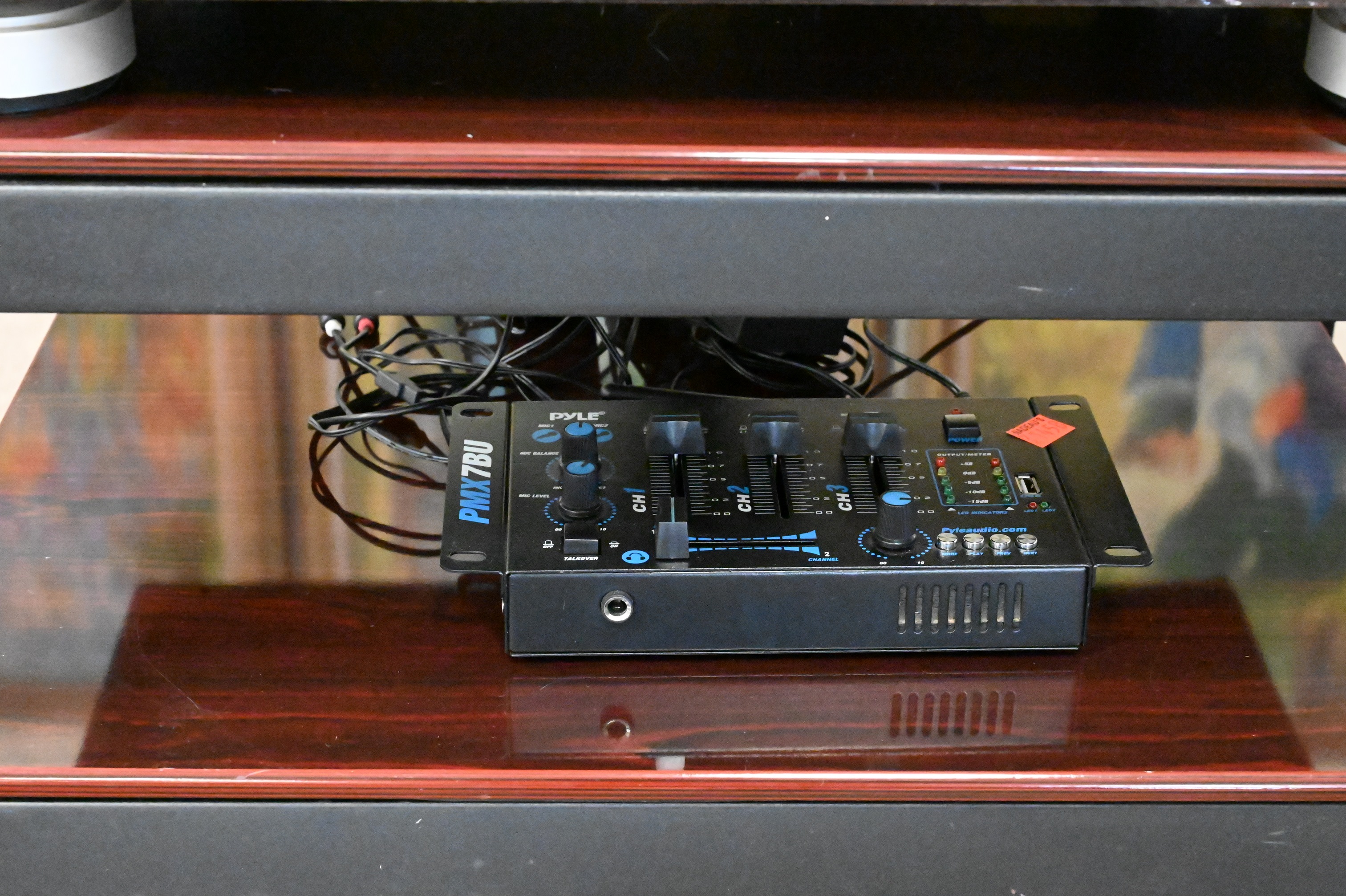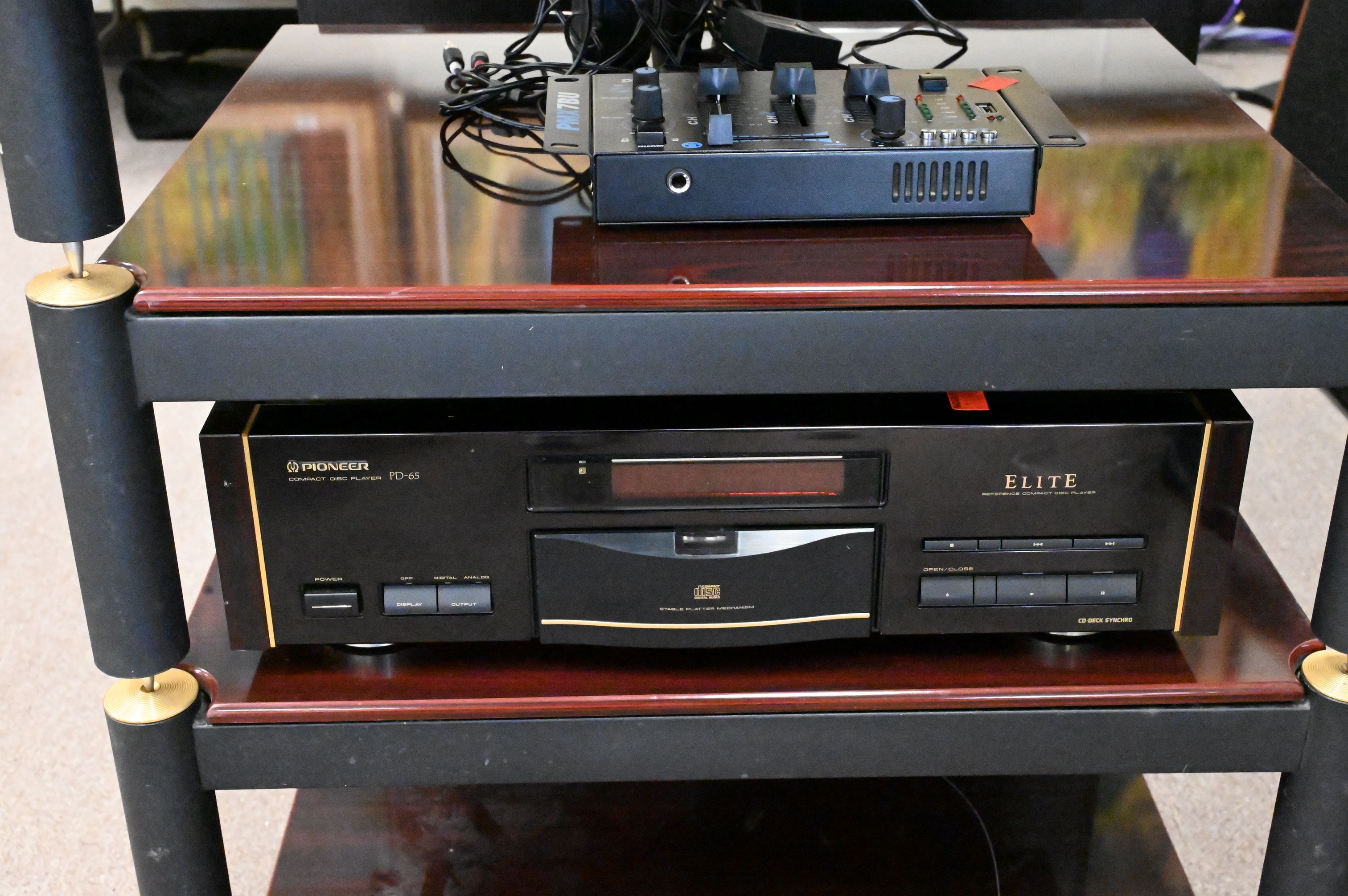Audio Group, to include JVC QL-Y55F turntable, Pioneer PD-65 Elite CD player with stand, along with Pyle PMX7B4 bluetooth, stand height 33 inches.