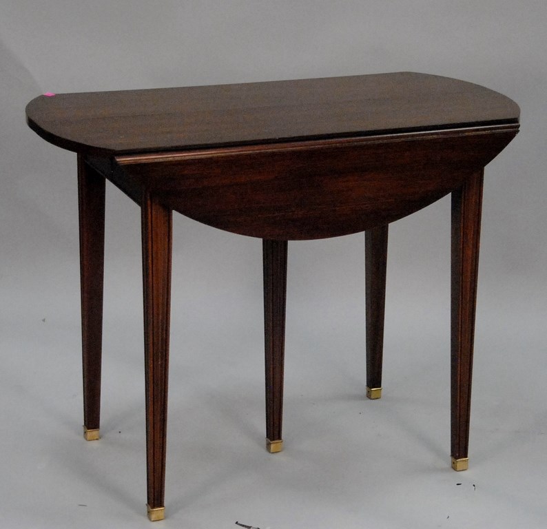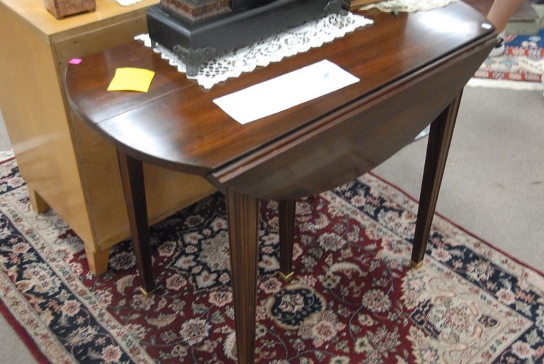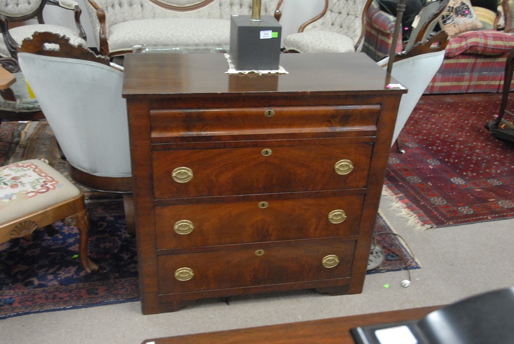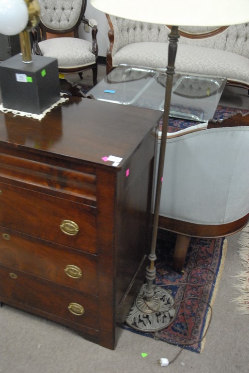 Empire four drawer chest, mahogany drop leaf table, and floor lamp.