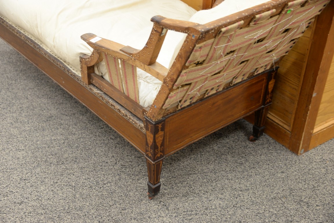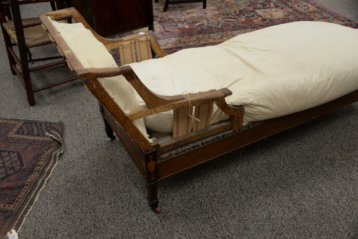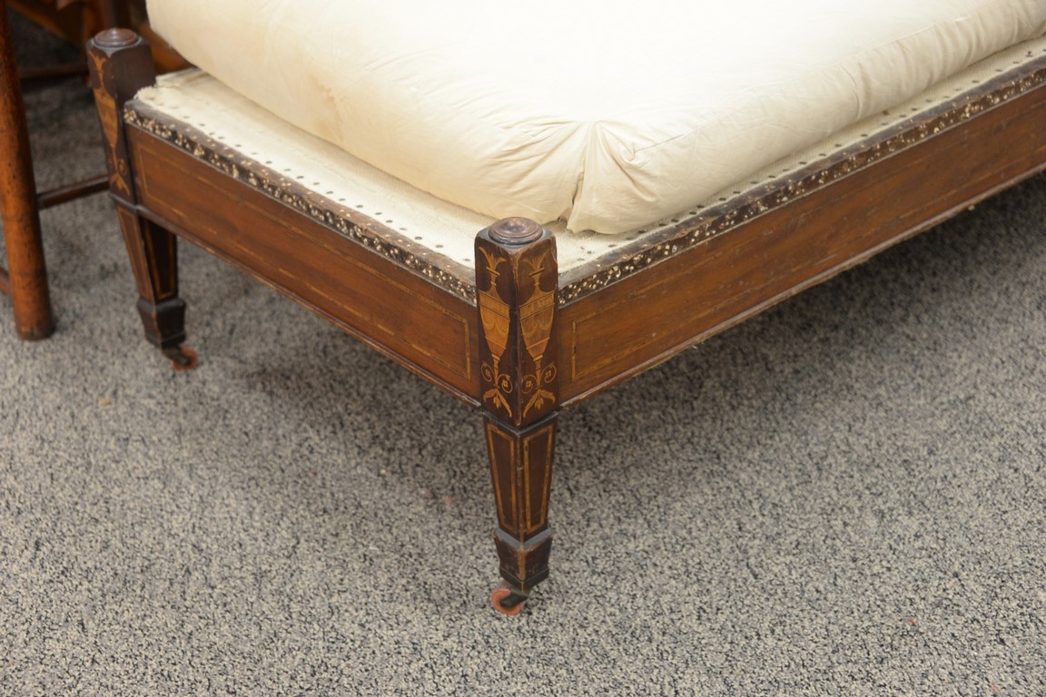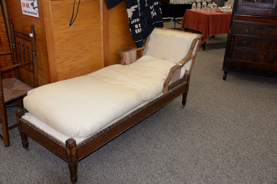 Lot 370: Federal mahogany chaise with fitted down cushion set on square tapered legs with urn and line inlays, circa 1800, in need of uphols…