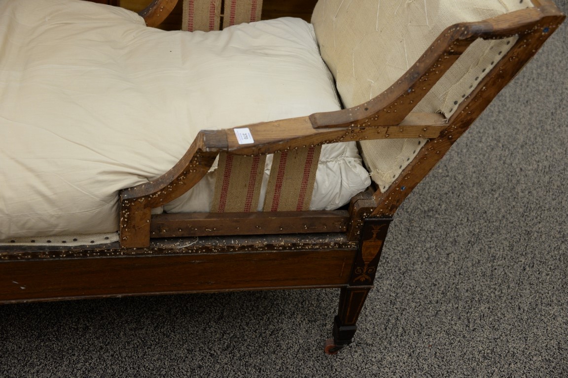 Federal mahogany chaise with fitted down cushion set on square tapered legs with urn and line inlays, circa 1800, in need of upholstery. ht. 74in., wd. 27in.