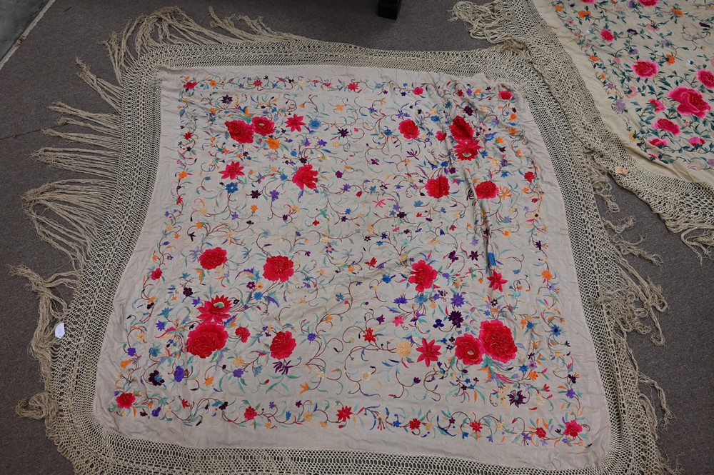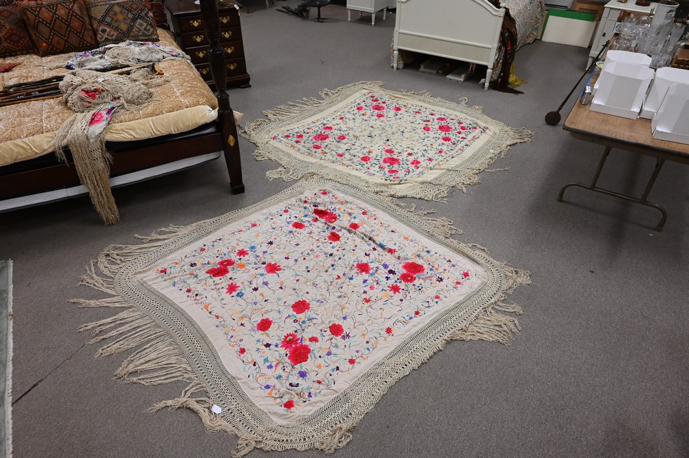 Lot 370: Four Chinese Silk Embroidered Piano Shawls, to include two black, two having colorful flowers, 6′ 2″ x 6′ 5″; 5′ 9″ x 5′ 10″; 6′ 5″ …
