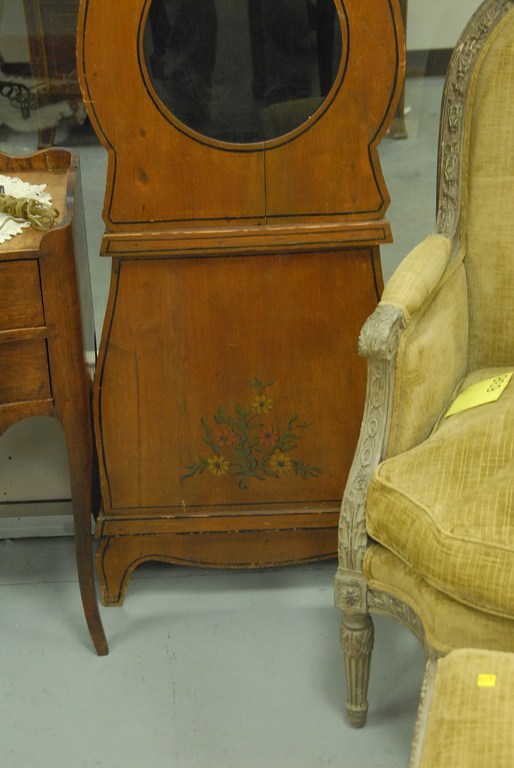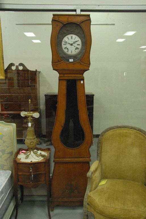 French tall case clock having round porcelain dial marked E. Saulnier a Regmalard surrounded by embossed brass in a pine case grain painted with flowers at bottom. Provenance: property from a home in Rockville Center, New York which was decorated by Iris Apfel. ht. 90in.