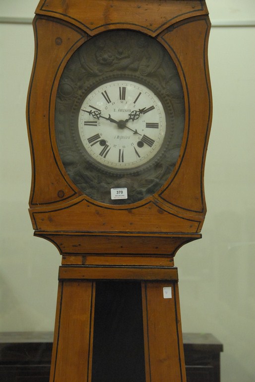 Lot 370: French tall case clock having round porcelain dial marked E. Saulnier a Regmalard surrounded by embossed brass in a pine case grain …
