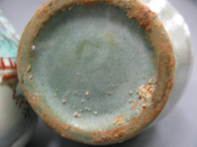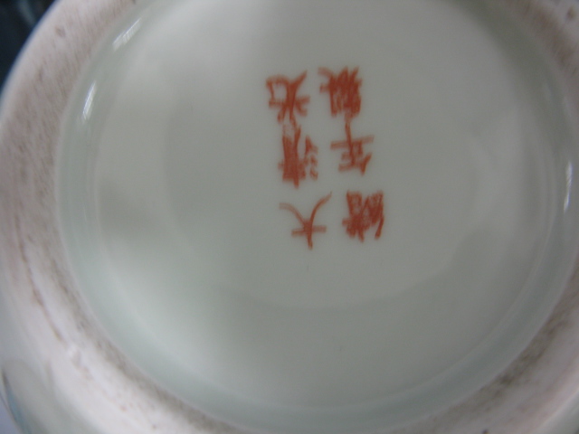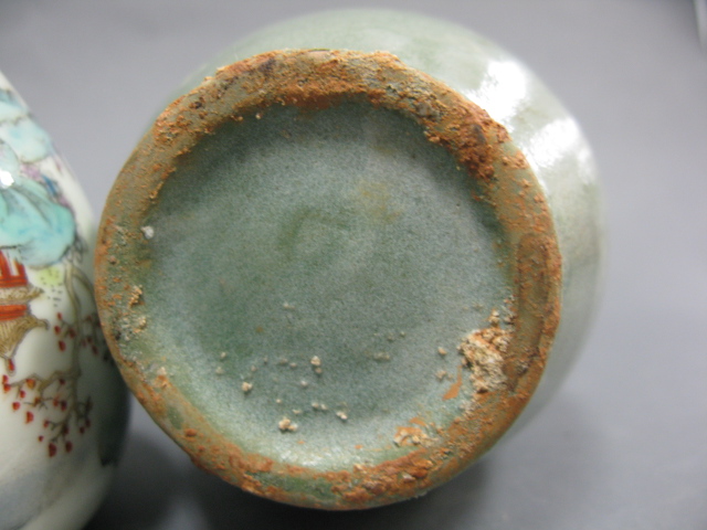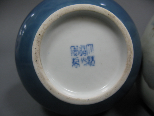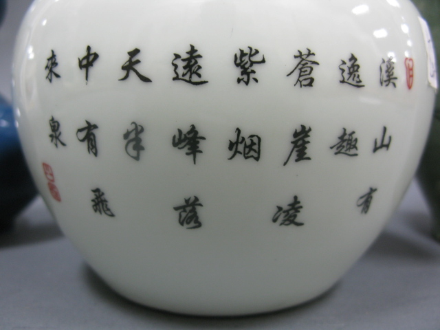 Group to include: Famille Rose pot with landscape scene marked with 6 characters Celadon glazed phoenix bird vase having painted flying phoenix birds Oriental blue glazed double gourde vase with two handles and marked on bottom with 6 characters