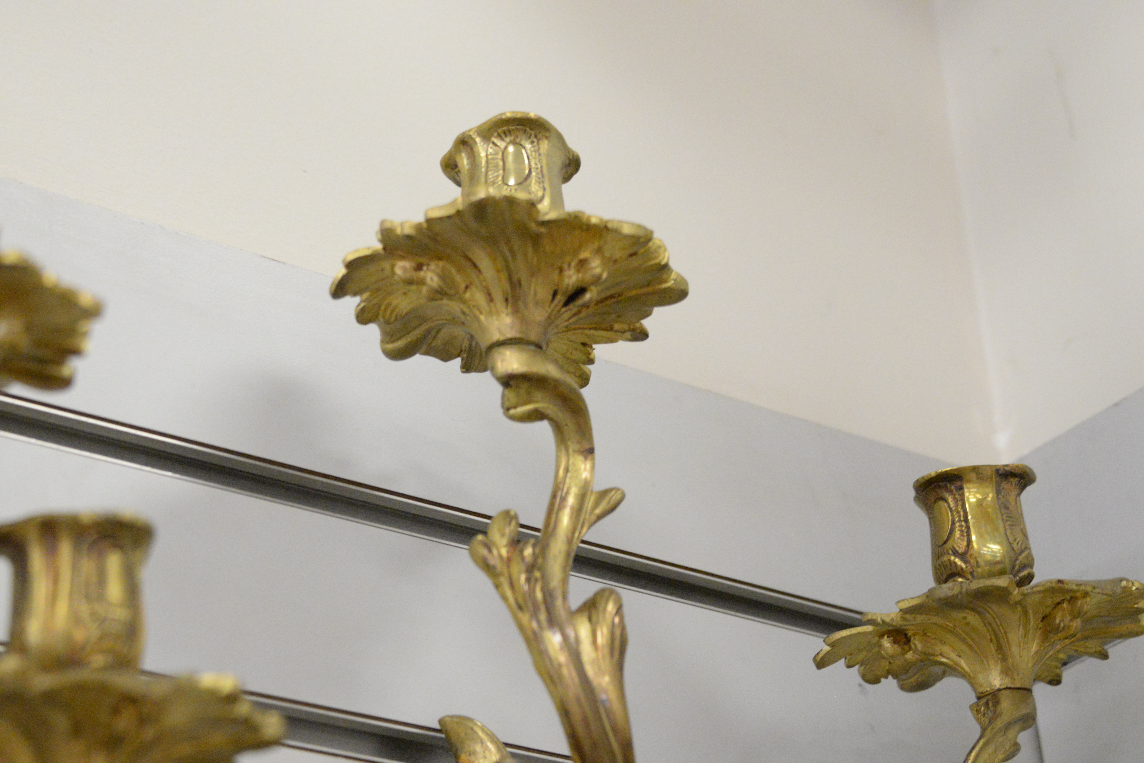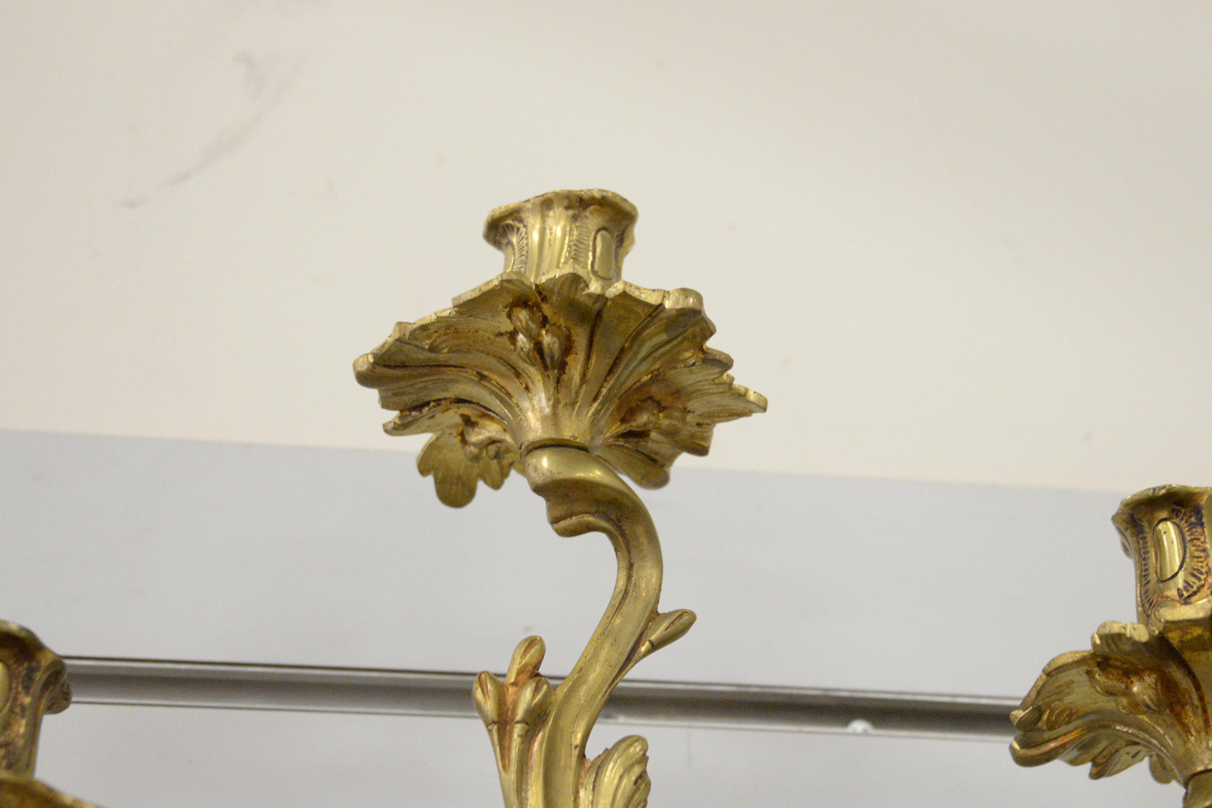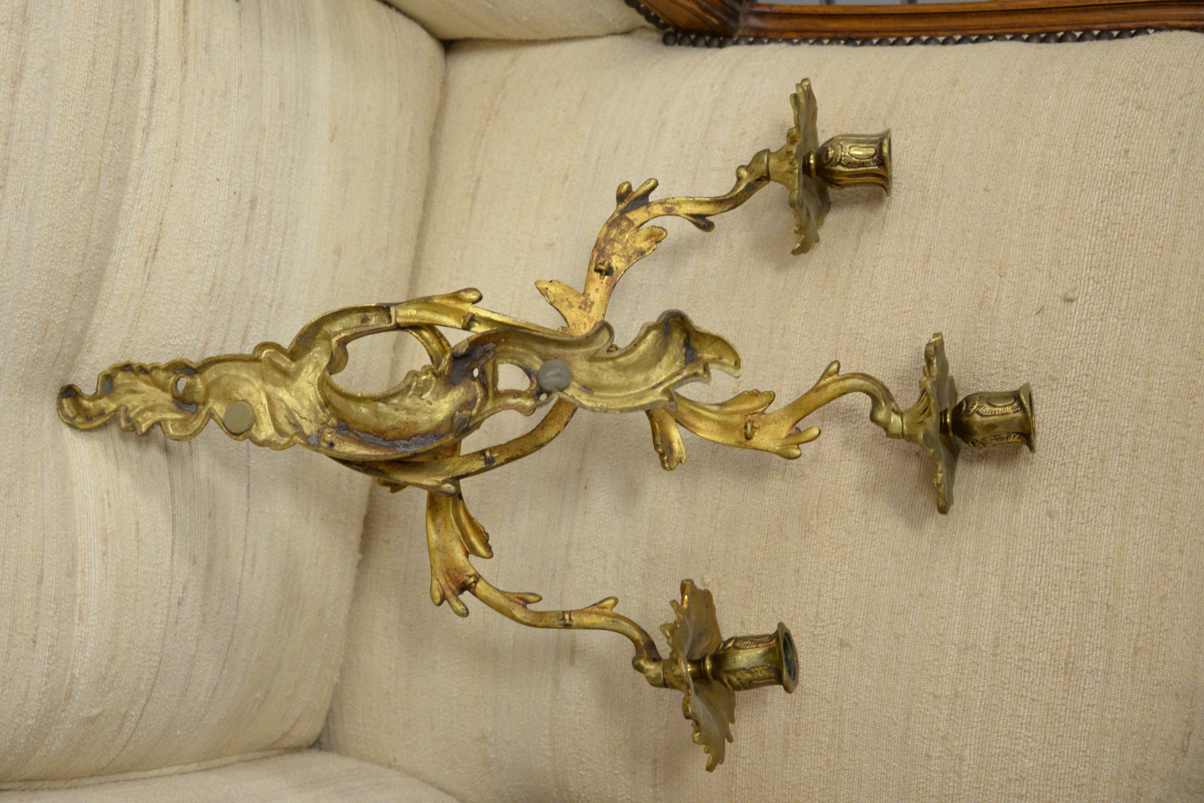 Pair of Brass Sconces, with three candle holders each, in floral motif, height 21 inches, width 15 inches
