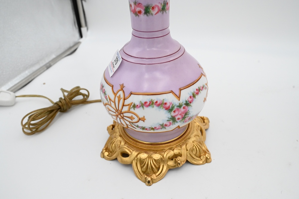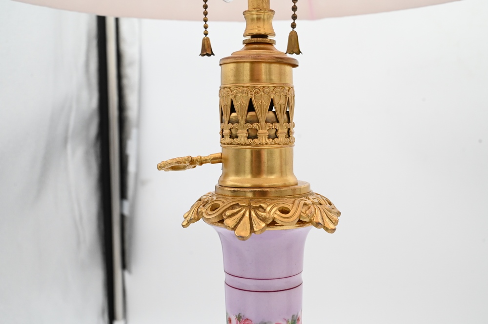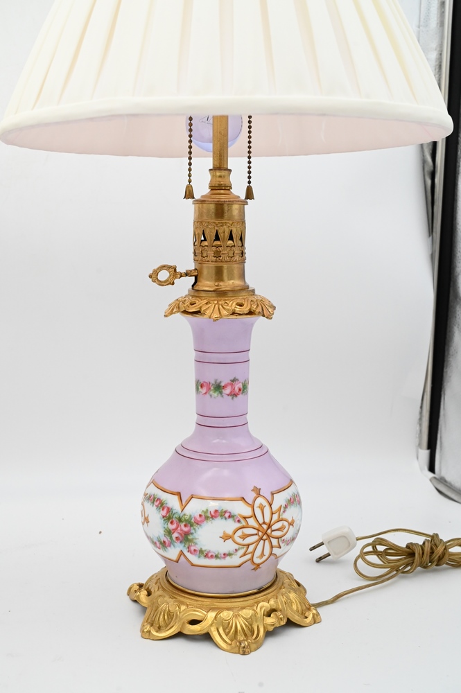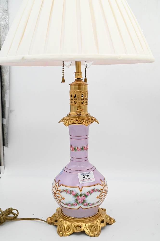 Lot 370: Pair of French Porcelain Oil Lamps, having bronze mounts made into table lamps, height 23 1/2 inches.