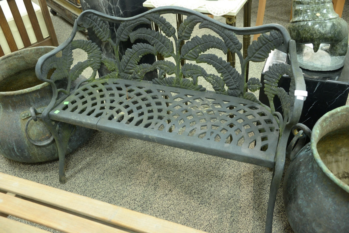 Pair of iron benches with fern motif, one marked Hinderer’s Iron Works New Orleans La one seat with short crack. ht. 30in., wd. 41 1/2in.