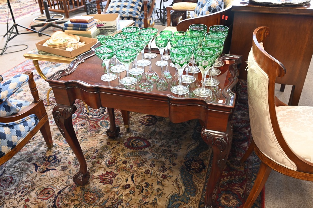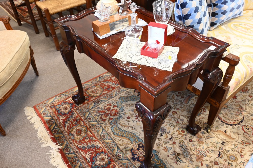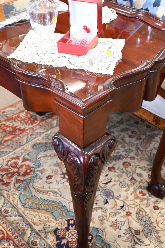 Lot 370: Pair of Mahogany Chippendale Style Tea Tables, having ball and claw feet, high gloss finish, height 28 inches, top 20 1/2 x 33 1/2 inches.